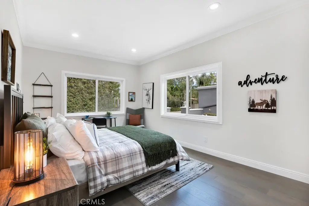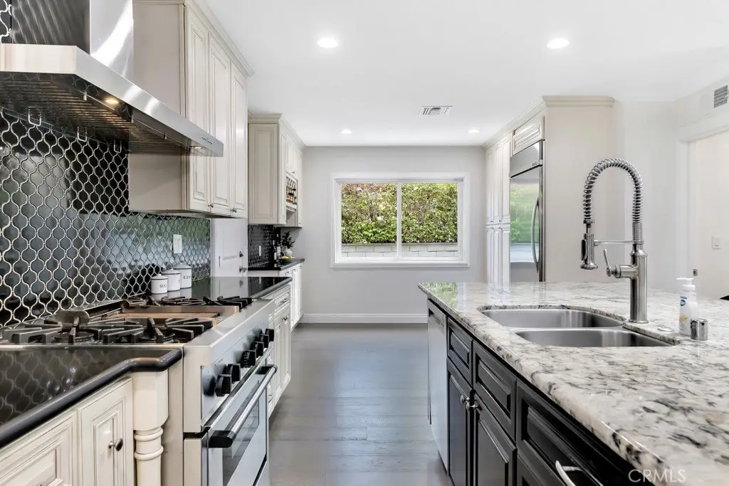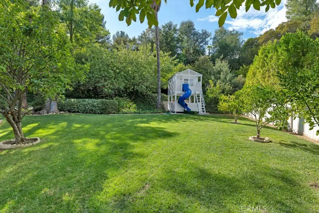 Welcome to your private sanctuary tucked away on a peaceful cul-de-sac in the highly sought-after hills of Tarzana. This luxuriously renovated single-story home offers 5 bedrooms, 4 bathrooms, and 3,386 sq ft of refined living space on a sprawling 21,529 sq ft lot designed for both relaxation and entertaining. Step inside to experience the seamless flow of this modern open-concept layout, filled with natural light and sophisticated finishes. The heart of the home is the designer kitchen, featuring custom cabinetry, a striking black arabesque tile backsplash, professional-grade stainless steel appliances, and an oversized granite island perfect for gatherings. The kitchen opens to expansive living and dining areas anchored by a floor-to-ceiling double-sided stone fireplace, creating an inviting ambiance for both casual and formal entertaining. Retreat to the spacious primary suite, complete with a walk-in closet, spa-inspired ensuite, and a private bonus room ideal for a home office, gym, or nursery. Each bedroom is thoughtfully positioned for privacy and comfort, including a guest suite with its own bath. Outside, experience your very own resort-style paradise. The sparkling pool with a Baja shelf invites you to unwind under the California sun, while the covered patio and string-lit pergola offer the perfect setting for al fresco dinners and weekend gatherings. A large grassy lawn provides space for kids or pets to play, complete with a charming 2-story treehouse and slide, while a hillside viewing deck delivers breathtaking sunset views over Tarzana’s rolling landscape. Blending luxury, comfort, and tranquility, this home perfectly captures the essence of Southern California living — a rare find in one of Tarzana’s most desirable neighborhoods. Close to premier shopping, dining, and top-rated schools, this property truly has it all.
