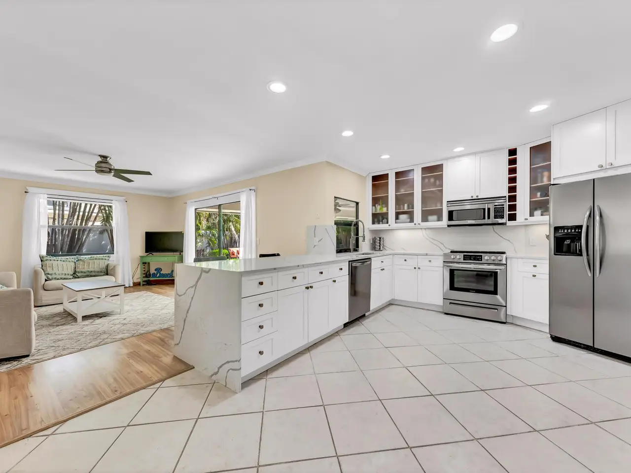 Welcome to the charming Village of Tequesta! This home perfectly blends small-town character with an unbeatable location. Inside, you'll find 3 spacious bedrooms, 2 full bathrooms, and a versatile den that can be used as an office or easily converted into a fourth bedroom. The split floor plan offers two separate living areas, giving everyone space to relax and enjoy. The newly renovated kitchen is light, bright, and open--featuring beautiful quartz countertops, newer stainless steel appliances, and a seamless flow into the dining and living areas. The main living room boasts vaulted ceilings and luxury vinyl flooring, creating a modern yet comfortable atmosphere. SEE MORE REMARKS...