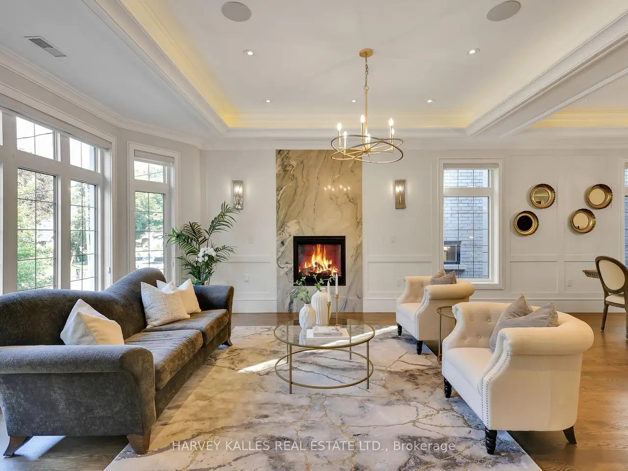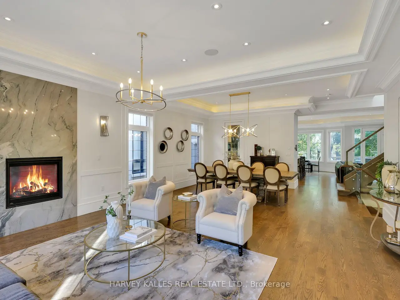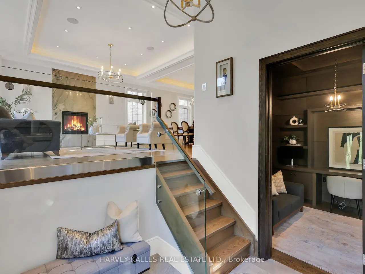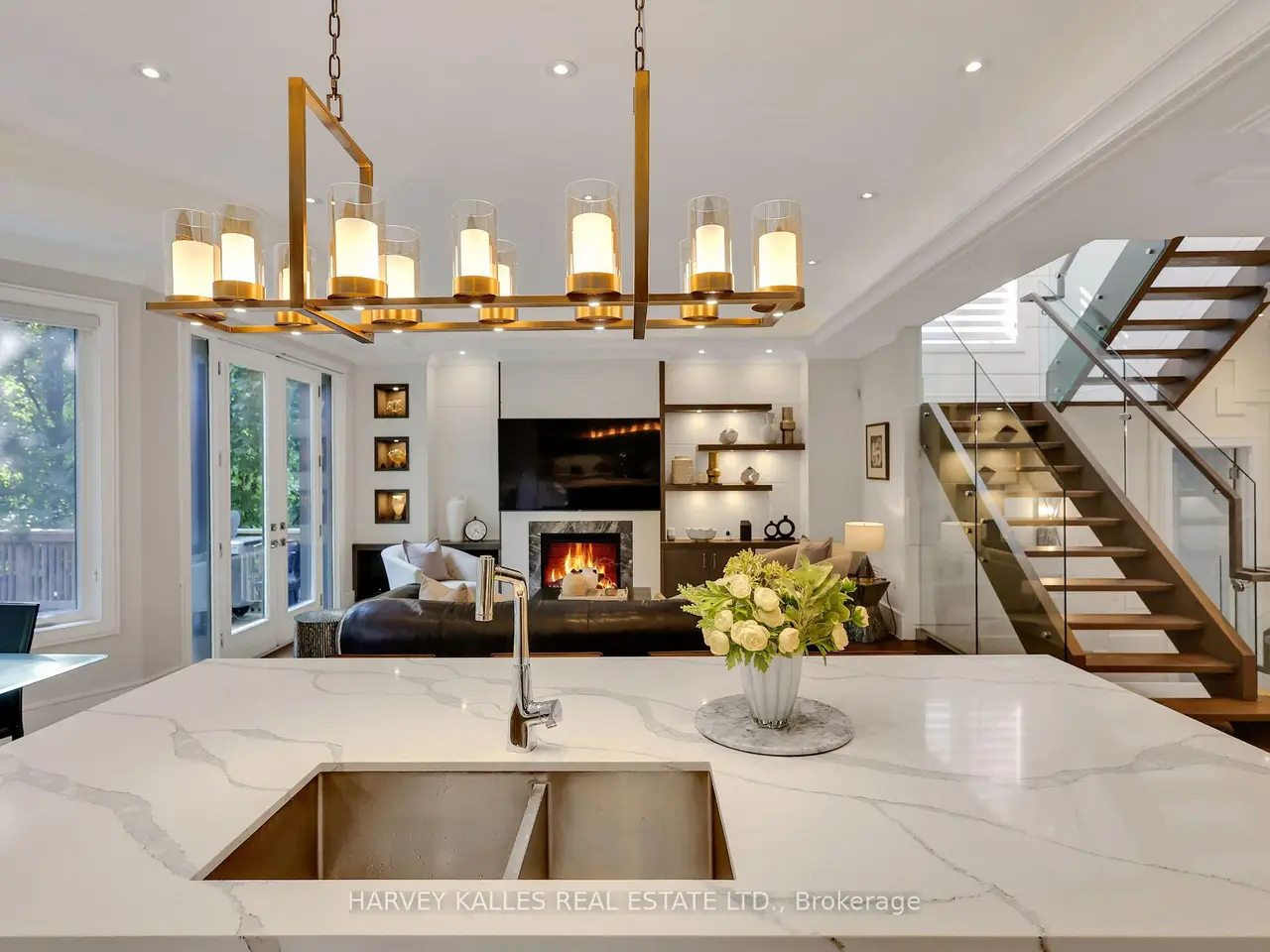Magnificent Custom Home Nestled on a Quiet Court. Featuring a striking limestone and brick exterior, this residence showcases a modern open-concept design with soaring ceilings and a contemporary open-riser staircase. The chef-inspired eat-in kitchen boasts a large center island, top-of-the-line appliances, a convenient servery, and a breakfast area overlooking the gardens, seamlessly connecting to the dining and living spaces. The family room offers a cozy fireplace and walkout to the terrace, enhanced by a skylight that fills the space with natural light. Additional conveniences include upper and lower-level laundry rooms. The primary suite offers a tranquil retreat with a spa-like 6-piece ensuite and walk-in closet. The lower level is designed for entertaining, complete with a wet bar, radiant heated floors, and a walkout to the yard.