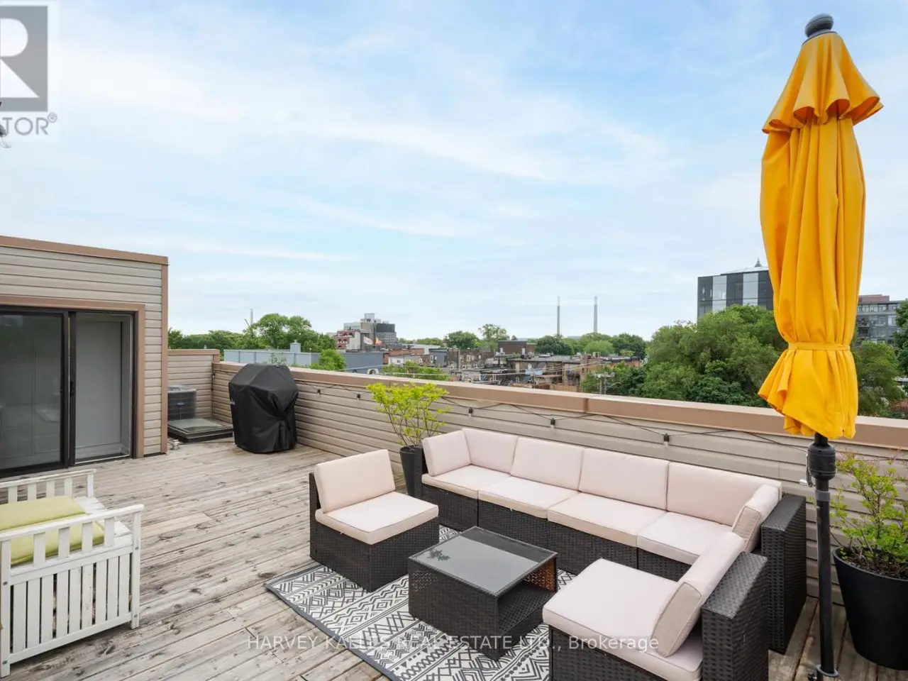 Welcome to Riverside Towns, where space, light, and lifestyle meet. This rare 1,380 sq. ft. end-unit townhome impresses with its wide, sun-filled layout, hardwood floors, and versatile office/den. The sleek kitchen is a chefs delight with Caesarstone counters, stainless steel appliances, gas stove, and an oversized pantry, seamlessly connecting to the open living and dining areas for both effortless entertaining and everyday comfort. A convenient main floor powder room completes the picture.Upstairs, two spacious bedrooms offer abundant storage, including wall-to-wall closets and a skylit second bedroom. The serene primary suite features west-facing windows and a private ensuite.The highlight is a sprawling rooftop terrace with gas BBQ hookup and spectacular CN Tower and skyline views, creating an unrivaled setting for al fresco dining, entertaining, or simply unwinding at sunset.Perfectly positioned in Riverside, just steps to Queen East boutiques, dining, the Broadview Hotel, 24hr TTC, and the DVP, this move-in-ready home is a rare offering that combines function, style, and one of the best rooftops in the city. (id:6370)