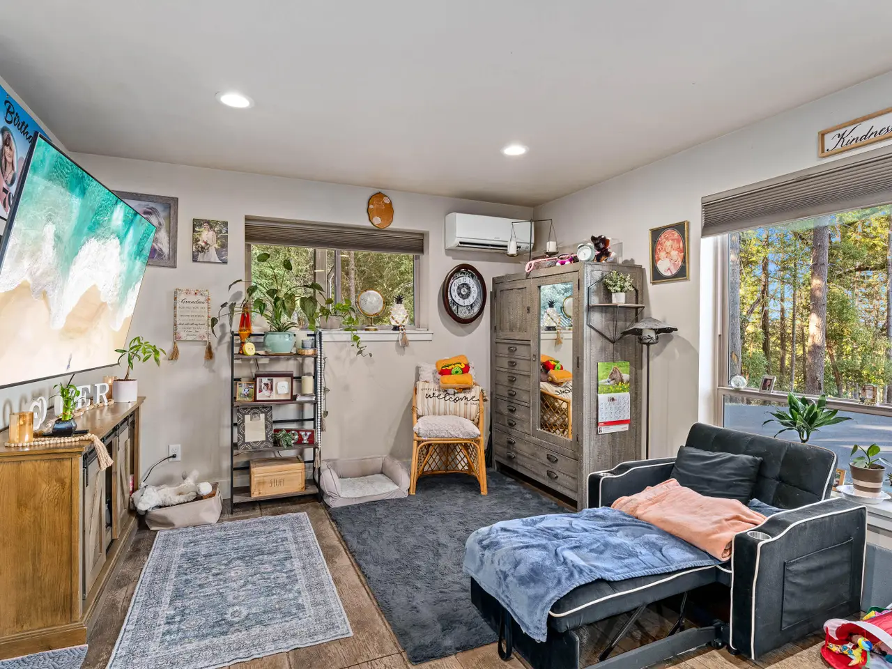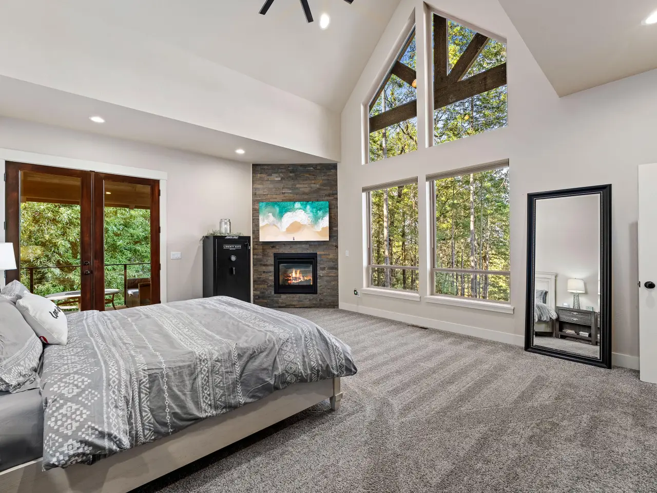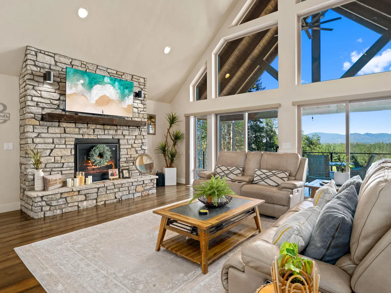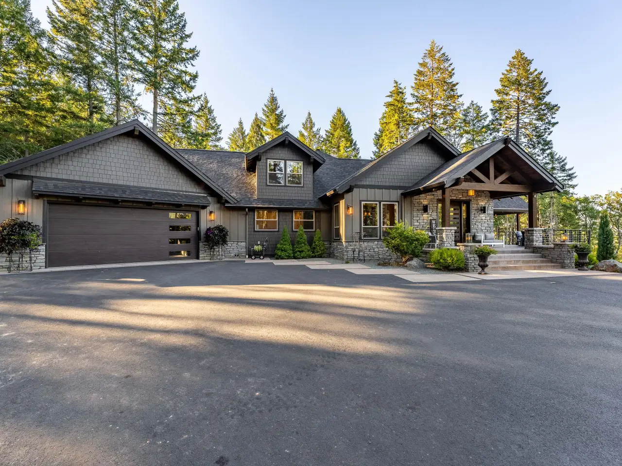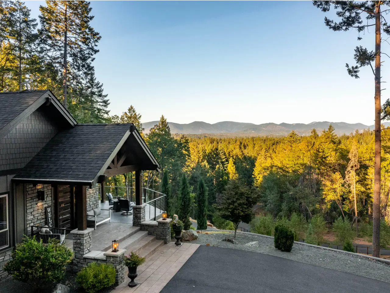 Mountain Lodge Retreat!! Custom Home is app 3157 sq ft, 4 bed, 4.5 baths, with additional Studio D/S of app 390 sq ft for visitors or family. Perched perfectly on 3.43 acres overlooking the valley, hills, and the city in the distance. Upon entry, greeted with soaring vaulted L/R, gas fireplace, expansive windows that allow for stunning views, natural light, and access to the open beam covered porch. Primary ensuite, is vaulted as well, with its own gas f/p & side porch. Main bath offers heated tile flooring, curb less oversized shower, soaker tub, spacious walk in closet, and water closet. Expansive kitchen is equipped with high end appliances designed for both serious cooking and entertaining. The loft hosts a 2nd ensuite, and seating area. The main floor also offers a spacious dining room, 2 b/r full guest bath, 1/2 bath for guests, and large laundry room. There is interior & exterior access to the fully equipped guest studio quarters below. Property is fenced, with lush back lawn.