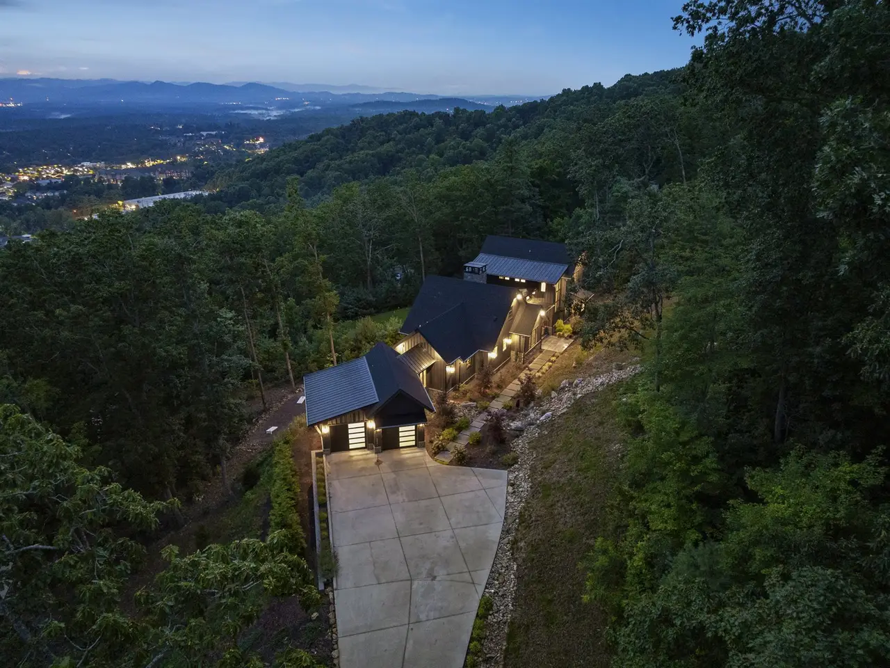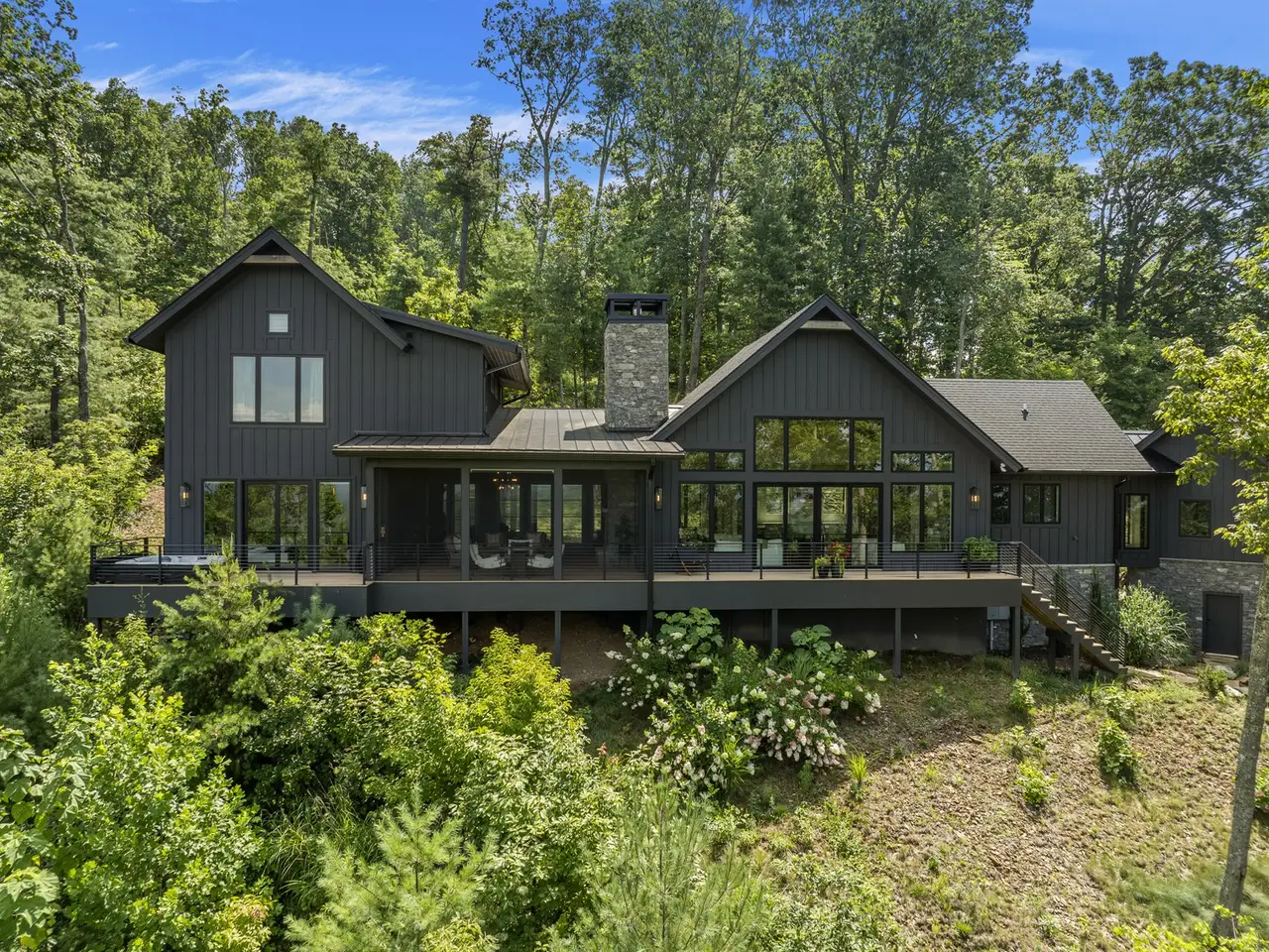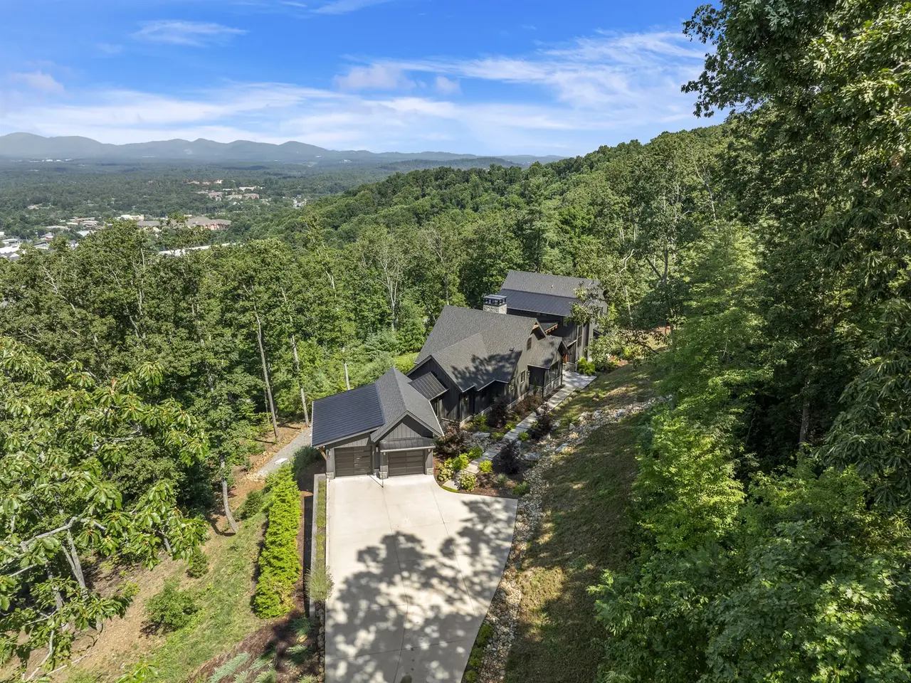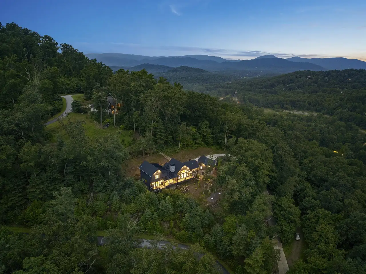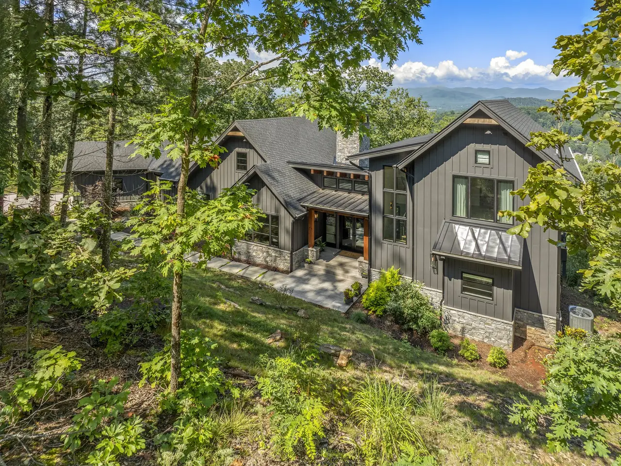 Set on over two private and gated acres, this mountain modern residence defines refined luxury. Built by an award-winning Parade of Homes builder and perfectly sited to capture long-range views of South Asheville and the Blue Ridge Mountains, the home offers complete privacy while just two miles from groceries, fitness, and conveniences. Featuring main-level living and green-built efficiency, it's an ideal primary residence or effortless second home. Floor-to-ceiling windows fill the interiors with natural light and frame breathtaking mountain views. Open living areas flow seamlessly to outdoor spaces for entertaining or a quiet retreat. With three bedrooms and three-and-a-half baths, this home blends craftsmanship, comfort, and style while creating a private, sustainable, and elegant mountain sanctuary.