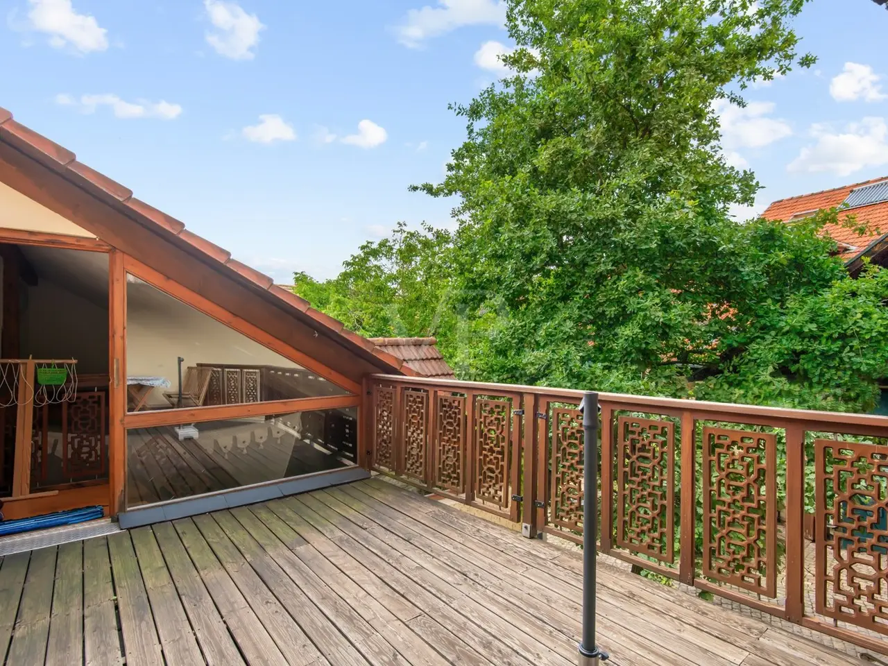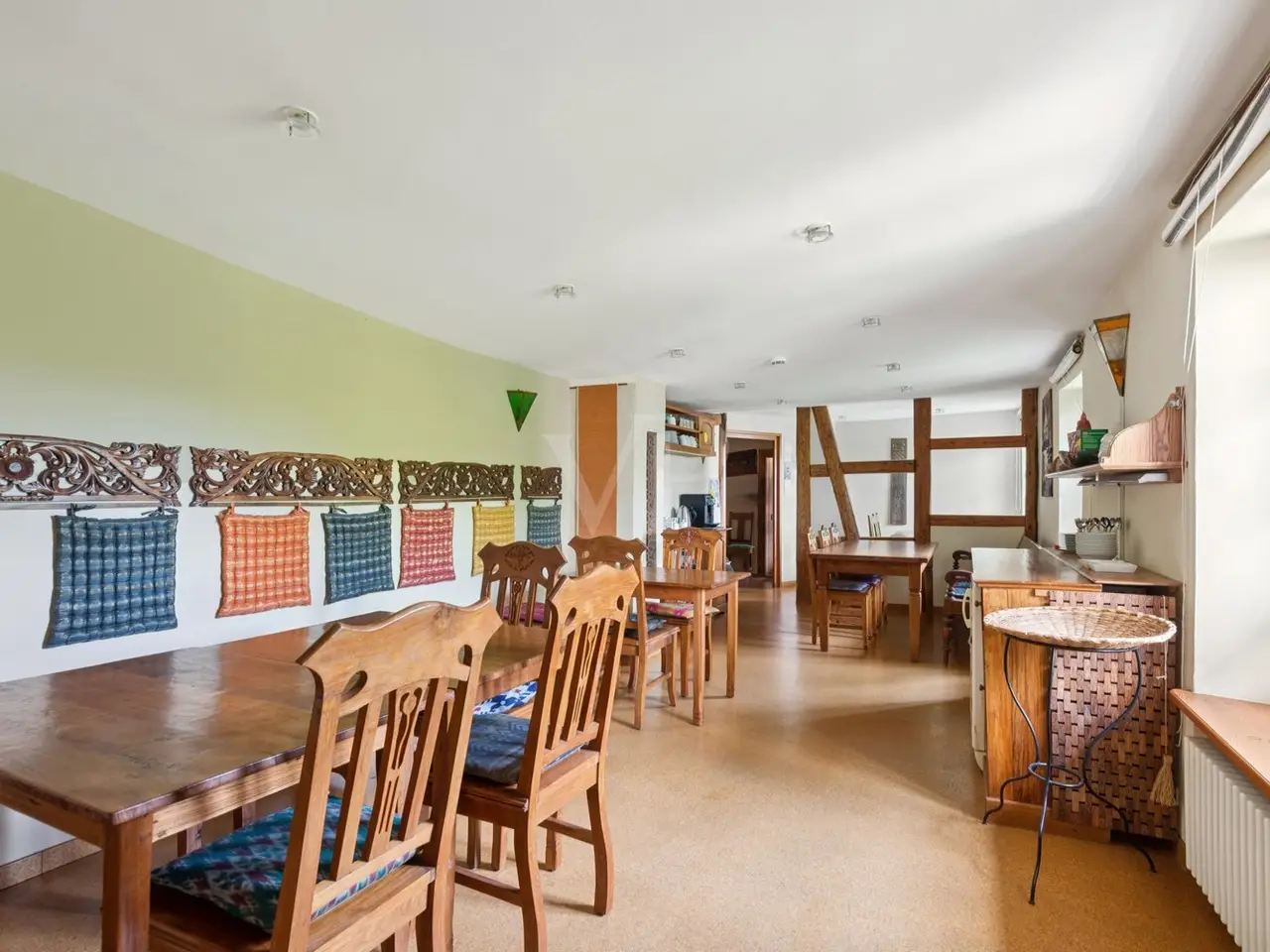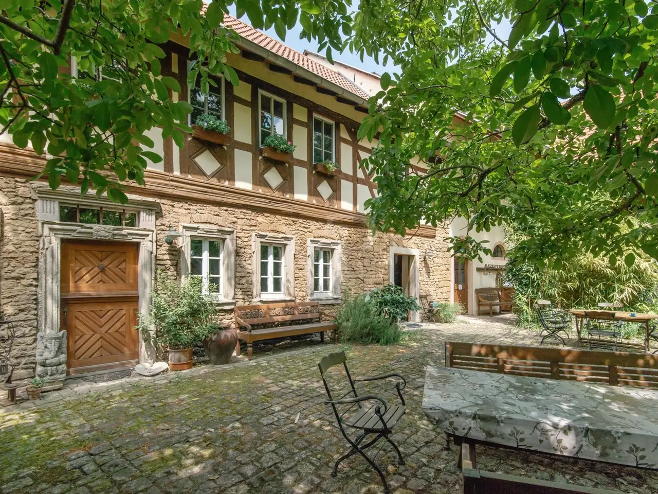 The property on offer here, in the form of a listed 3-sided farmhouse, combines Rhine-Hessian history with modernity as well as a high quality of living and working in a quiet yet very well connected location in an incomparable way. The property, which was first mentioned in the church records of the Eberbach monastery in 1591, consists of a main house with a first floor apartment with a private terrace for personal use, with individual guest and hotel rooms including bathrooms on the upper and top floors, as well as a hotel kitchen, a breakfast room and a training room on the top floor with a view over Eckelsheim. There is also an apartment building opposite in the courtyard with three apartments of different sizes, each equipped with a kitchenette, bathroom, dining and sleeping area. The top floor apartment also has a roof terrace. If this space is still not enough for you, the two adjoining barns offer plenty of scope for further expansion on the ground and top floors. This constellation offers future owners all kinds of living and usage options. Whether multi-generational, live and work, live and rent, commercial, Airbnb, bed and breakfast or as a complete investment, all of these can be combined and implemented here. The farmstead was completely renovated in 1990 and has been continuously expanded. Great importance was attached to the historical character and the building biology aspects using clay plaster, cellulose and wood fiber insulation. From an energy point of view, efficient condensing boilers powered by liquid gas with solar hot water support have been installed. The service water is supplied by a professional system from a 12 m³ cistern. After entering the property through the archway into the cobblestone courtyard with its old trees, you immediately feel at ease, unseen and at home. It immediately slows you down from a stressful everyday life. Once you have found your way around, you will be surprised that such a courtyard and building ensemble, which has been renovated with so much attention to detail, refurbished and well maintained, is so inconspicuous in the middle of an old village center. The individual guest rooms and apartments are all individually designed and have an Asian touch and cultural elements. An equally important aspect for future owners is the fact that no fundamental renovations are pending. Exceptions to this are the further expansion areas in the barns. You will find a detailed breakdown of all other conversions of the individual buildings over time, as well as the floor plans, under "Features, details" and "Layout". You are welcome to view this exclusive property on site and let the details speak for themselves.