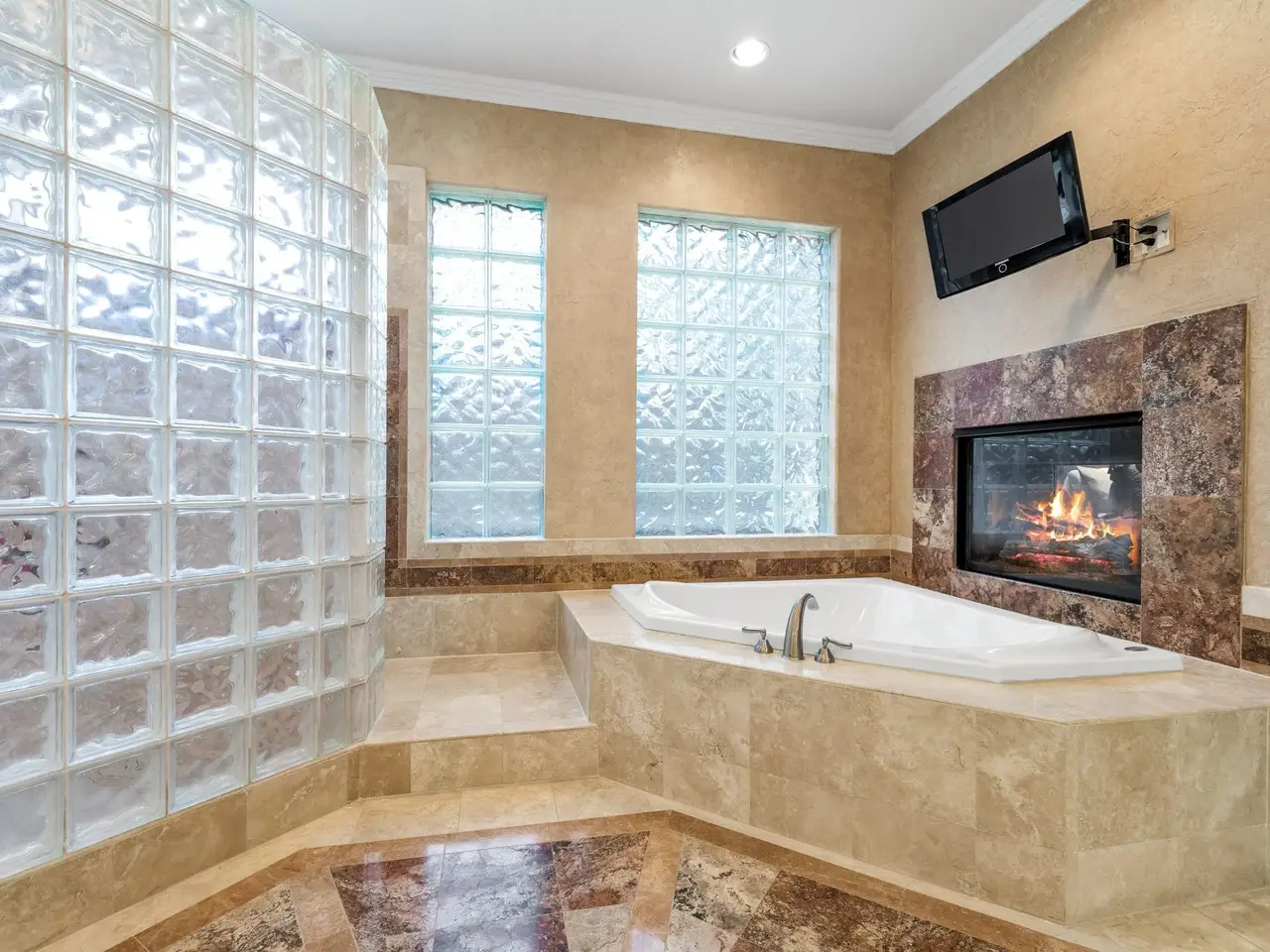 Spa-like primary bath with see-through fireplace