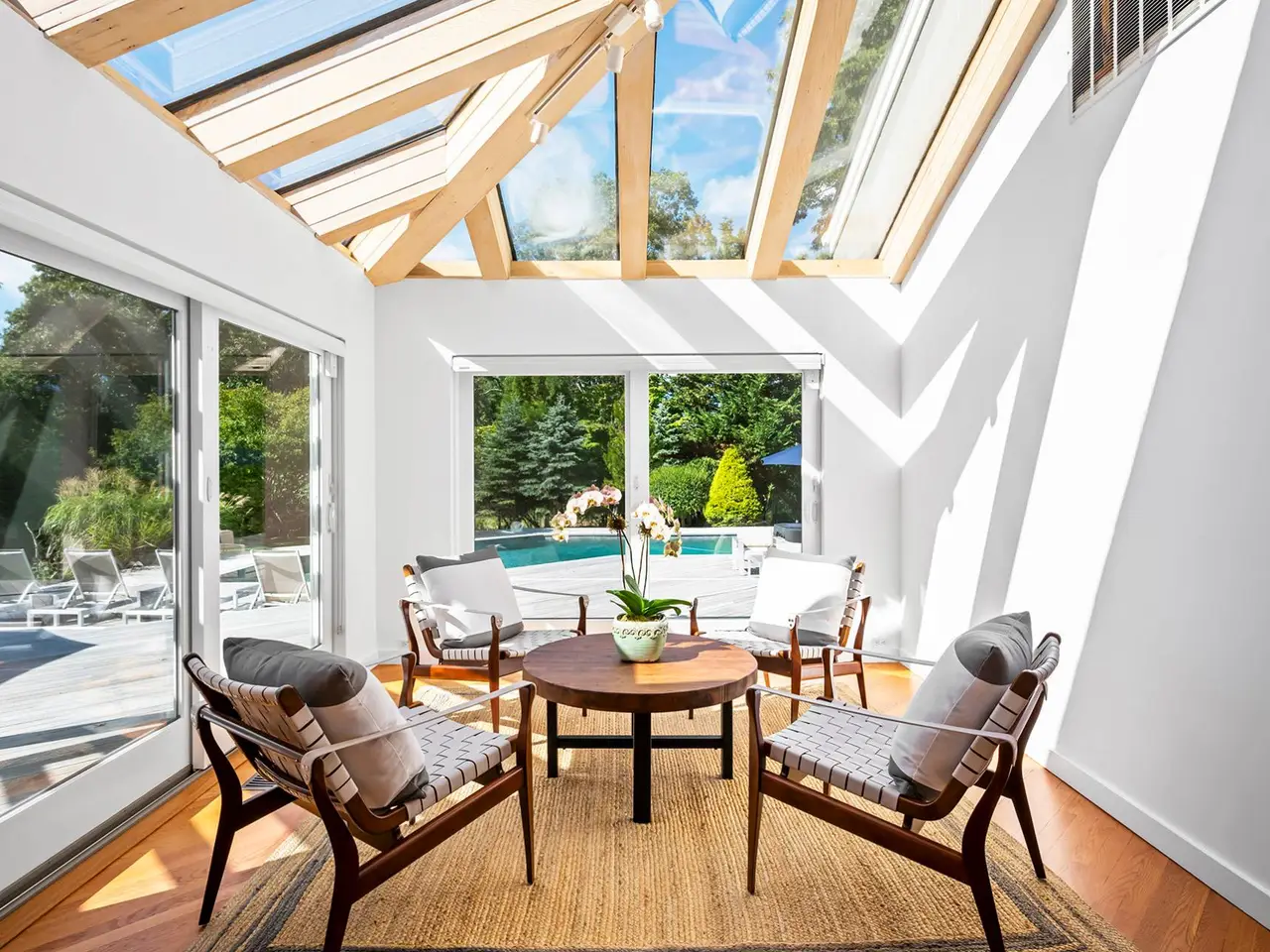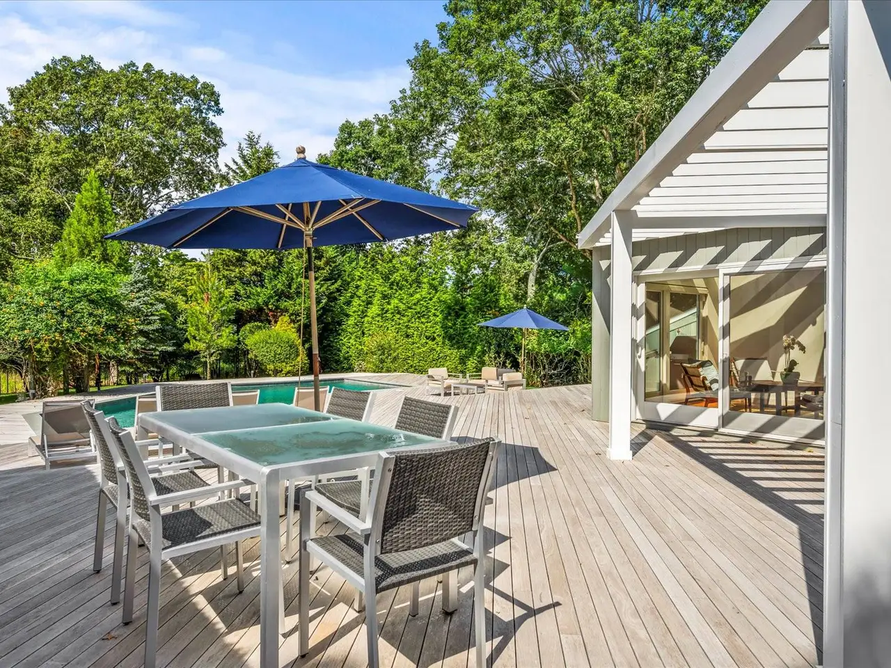 This sun-filled contemporary home situated on a private 1 +/- acre was meticulously renovated in 2021. A thoughtfully designed floor plan provides 3,500 +/- square feet of open living space, 3 bedrooms, 3 baths and a den. The dramatic open-concept layout is highlighted by expansive skylights that fill the home with natural light. The first floor features a living room with fireplace, a stylish dining area, a sleek eat-in kitchen and comfortable family room, all seamlessly integrated. Walls of sliding glass doors connect the interior to an expansive multi-level wood deck surrounding a heated gunite pool, providing a relaxing indoor-outdoor lifestyle. The first floor also includes two separate bedroom wings; a tranquil primary suite and an additional guest suite with a full bath and adjacent den. Upstairs, a private loft-style bedroom suite features its own deck overlooking the pool, offering an ideal retreat for guests. Additional amenities are a full unfinished basement, a two-car garage, and mature landscaping. Enjoy close proximity to Quogue Village shops, dining and beach - making this a perfect year-round residence or weekend escape. Listing ID: 925757