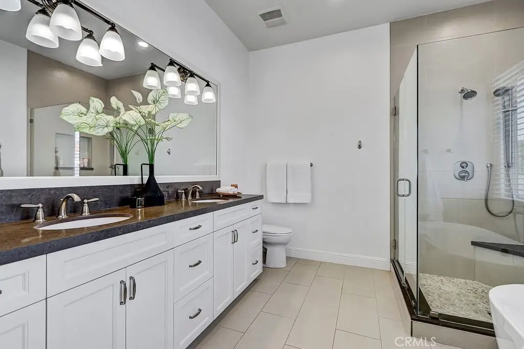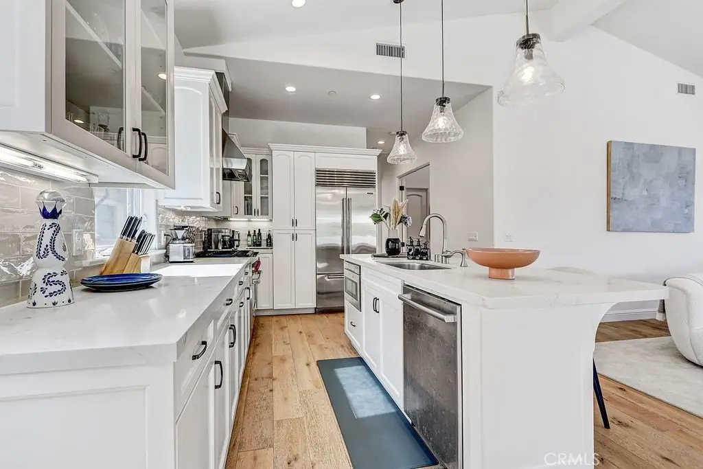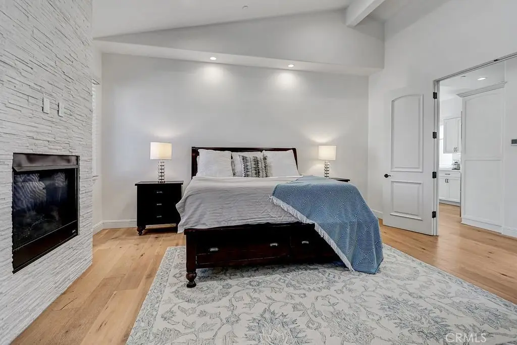 Tucked away on a serene, tree-lined street in South Redondo, 105 S Juanita Ave blends coastal living with refined design in a detached Mediterranean-style townhome that offers the privacy and comfort of a single-family home. Located just minutes from the beach, this custom-built residence by Dennis La Charite Construction (2017) offers 4 bedrooms, 3 bathrooms, and a thoughtfully designed layout filled with premium finishes. The upper level welcomes you into an expansive great room where vaulted ceilings, wide-plank oak flooring, and an abundance of natural light create an open, airy atmosphere. A spacious tiled deck—complete with a built-in gas line—extends seamlessly from the living area, ideal for indoor-outdoor living. The chef’s kitchen features Quartz countertops, high-end Wolf and Sub-Zero appliances, custom cabinetry, and a large center island with bar seating. A granite-faced fireplace serves as a cozy focal point in the adjacent living and dining areas. The primary suite is a luxurious sanctuary with vaulted ceilings, a stone-accented fireplace, custom walk-in closet, and a spa-like bathroom featuring dual vanities, a walk-in shower, and a freestanding soaking tub. Also on the upper floor are a dedicated office space and a second full bathroom. Downstairs, two spacious bedrooms share a well-appointed bathroom with dual sinks. This level also includes a laundry room and direct access to a finished two-car garage with epoxy flooring and storage space. Located near top-rated schools, local parks, boutique shopping, and the iconic South Bay coastline, 105 S Juanita Ave offers a harmonious blend of luxury, comfort, and beachside convenience.
