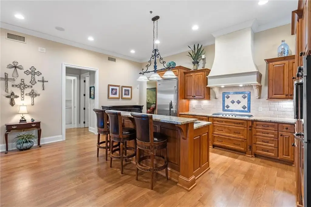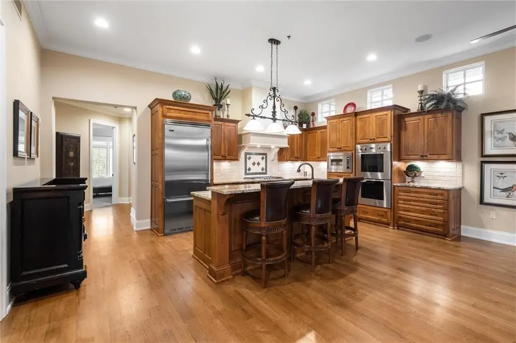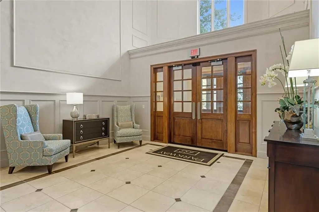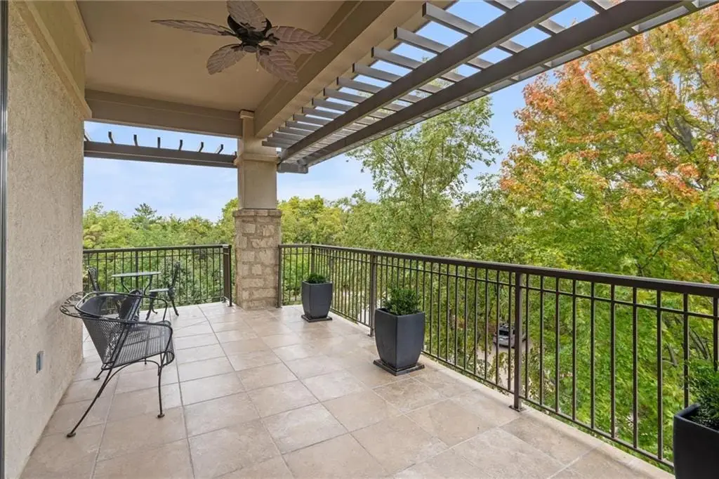 Stunning Top-Floor Condo in Highly Sought-After Parkway 133. This light-filled, top-floor condo offers luxury living with balconies on two sides of the building. From the moment you enter, youre greeted by soaring 10.5-foot ceilings and gleaming hardwood floors that flow throughout the home.The spacious great room features custom built-ins, a gas fireplace, crown molding, and access to a large balcony with remote-control shades. The formal dining room is enhanced with beautiful wainscoting, perfect for entertaining.The eat-in kitchen is a chefs dreamfeaturing a large center island, Viking stainless steel appliances including a gas cooktop, double oven, microwave, dishwasher, and refrigerator. Additional highlights include soft-close cabinetry, granite countertops, and a generous walk-in pantry with pull-out shelves.The luxurious primary suite offers a private balcony for enjoying morning sunrises, a large walk-in California closet, and a spa-inspired bath with separate granite-topped vanities, an all-tile shower with dual heads, a whirlpool tub, pocket door, and abundant storage. The second bedroom includes its own private bath with granite counters, tile flooring, and a shower. Both bedrooms feature custom plantation shutters.The den/office includes built-ins and a separate hallway exit for added safety. The laundry room provides excellent function with a sink, solid-surface counter for folding, plenty of cabinetry, and includes the washer and dryer.Additional highlights include two parking spaces in the heated garage and driveway, a private storage unit, and a newer HVAC system. The HOA covers gas, water, and trash. The balconies provide 648 sq ft of outdoor living space. Dont miss this rare opportunity to own a top-floor residence in Parkway 133where location meets convenience with easy access to shopping, dining, walking trails, and major highways.