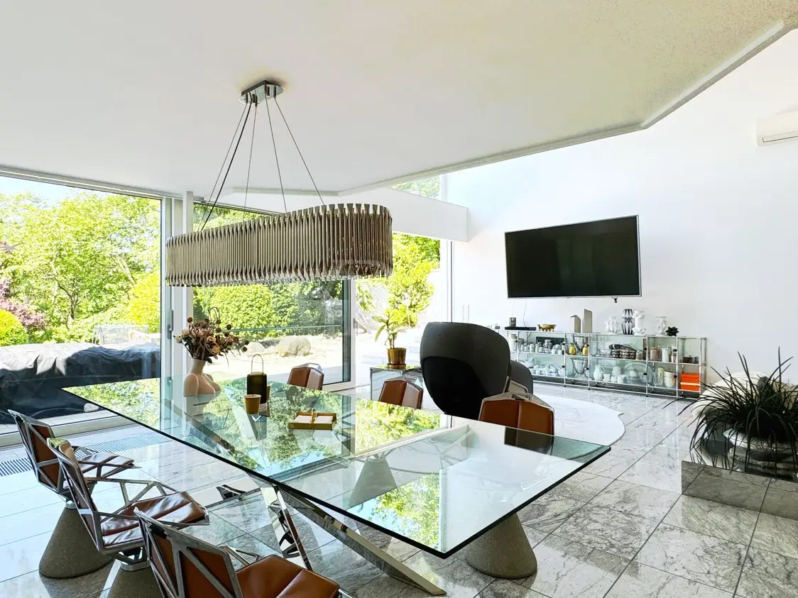 A rarity in the first row above the Bottigtal - Friedrichsdorf-Seulberg! Precious natural materials and modern building technology form an incomparable symbiosis in this impressive Bauhaus-style villa, whose architecture conveys lightness and a floating effect. The result: a luxurious home to feel at home in, equipped with every conceivable detail to make living an experience. Large glass fronts, granite stone and stainless steel - these are the basic elements that are stylishly reflected in and throughout the house and create a unique atmosphere reminiscent of a vacation in a luxury hotel. As soon as you enter the property, you can see the perfect staging of the various areas - the entrance in absolute privacy, the various entrances to different living areas, the park-like outdoor area with several terraces and a beautiful view directly into the Bottigtal nature reserve and, of course, a very spacious interior with various possible uses. The cozy lounge area with fireplace in front of the open-plan living and dining area and the versatile seating on the various terrace areas impress with their spaciousness, as the floor-to-ceiling, large windows facing the garden allow the indoor and outdoor areas to merge seamlessly. The modern designer kitchen with adjoining cold room and dining area in front leaves nothing to be desired, even for professional chefs, while also providing a cozy atmosphere for social gatherings with family and friends. The high-quality granite floors, which are not only found in the living area, are of timeless elegance and the best workmanship. Other areas on the garden level can be used in a variety of ways, including an indoor pool and whirlpool that have since been built over and could be reactivated with a little effort. A spacious home office or guest room with en-suite bathroom and the utility rooms are also located on this level. Another highlight on this floor is the inviting wellness area with sauna and floor-level rain shower. Two separate staircases lead to the second floor, where the gallery area and various bedrooms, offices, guest rooms and sports rooms with various bathrooms are spread over two wings. One of the bathrooms is adjoined by another sauna with a walk-in rain shower. Two staircases lead to the second floor, where various bedrooms, work and sports rooms with various bathrooms are spread over two wings. This underlines once again the versatility of the house, e.g. also as a two-family house (the individual living areas are already legally divided by a declaration of division). High hedges and walls all around the property ensure sufficient privacy and focus the view on the nature reserve directly in front of it with a magnificent view of the Bottigtal valley. The spacious double garage with adjoining parking spaces provides dry access directly into the house. This house can hardly be described, when would you like to experience it?