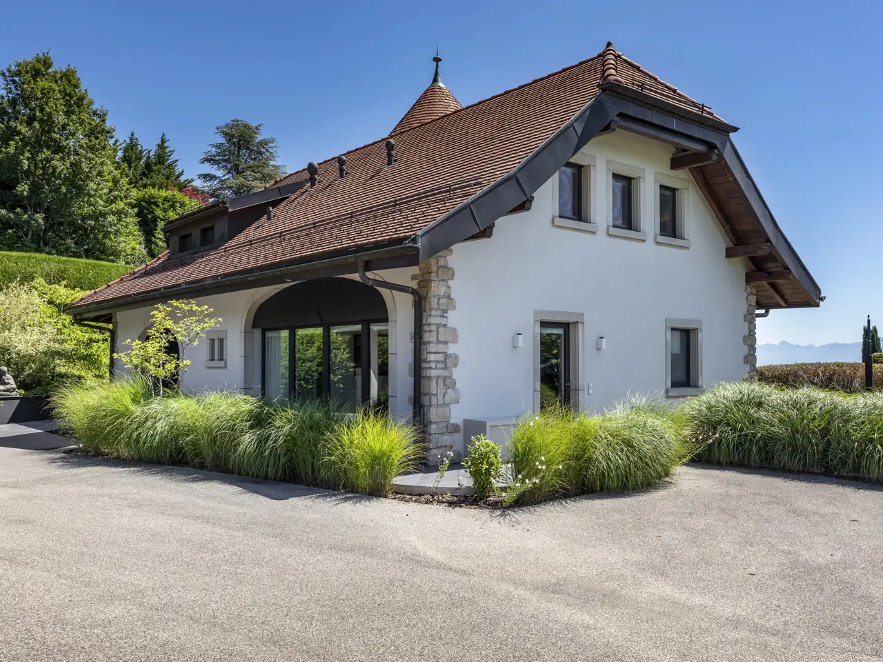 Located in the heart of a peaceful, leafy residential area in the sought-after commune of Givrins, this exceptional property offers a rare, serene living environment. Built in 1980 on a generous plot of over 2,670 m², the house underwent a complete renovation in 2019, incorporating noble materials and top-of-the-range features. With around 530 m² of living space on two levels, it boasts contemporary, atypical interior architecture, designed for an art of living that combines comfort, well-being and aesthetics. The first floor opens onto a vast reception room featuring a lounge with smoking area, as well as a remarkable wellness area equipped with indoor pool, hammam, sauna, changing rooms and sanitary facilities. The kitchen is the centerpiece of the house, seducing visitors with its elegance, functionality and central position, offering a breathtaking view of the surrounding fields, Lake Geneva and the majestic Mont-Blanc. An independent studio with kitchen, living room and shower room completes this level. Upstairs, the master suite features a bathroom, dressing room and access to a private terrace. Two further bedrooms with en suite bathrooms, an office and a laundry room complete this level. The partially excavated basement houses a home cinema, wine cellar, storage space, two utility rooms and a PC shelter. Outside, the landscaping has been carefully designed to guarantee privacy and tranquillity, with a large terrace, an unoverlooked garden planted with trees, a garden shed and a covered area for four vehicles. Offering an excellent level of maintenance and optimal energy performance, this property is a turnkey residence, immediately habitable by its future owner.