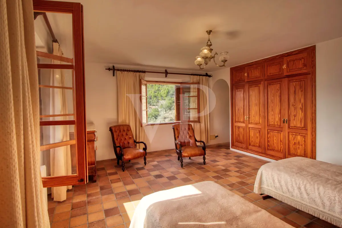 Situated on a fantastic hill at approximately 180 meters altitude, this spectacular property of almost eight hectares with a renovated eighteenth century house is for sale in Soller. A spacious and beautiful hall leads to this interesting property, a spacious living room with fireplace, a large room with a total of about 70 square meters. With direct access to a pleasant terrace of about 30 square meters. Fantastic rustic fitted kitchen open to the dining room with a slight slope and access to a covered terrace of approx. 60 meters with a built-in barbecue, as well as a pantry and cellar. On the upper floor there are five slightly sloping bedrooms and two large bathrooms, one of which is en suite. On the lower floor is the sixth bedroom suite. It also has a large office connected to the hall. In the basement floors it still retains its two old oil tanks with the possibility of reusing or reusing it for a cellar, the engine room as well as a warehouse and a cellar. One car garage in main building, plus large separate garage with space for four cars. Extensive olive grove in production, fruit trees such as 145 orange trees of the Valencia Late variety with drip irrigation, grape vines, apricots, medlars, lemon trees, kiwis, pomegranates... It has solar energy for sanitary water, city lights, oil central heating. With a large "safereig" water tank of 120,000 liters, two own unused water wells thanks to its two water sources that provide the necessary water all year round. Mallorcan shutters made of iron and wood in very good condition. A property that with just a few updates and improvements can become an exclusive property. There is also the possibility to build a swimming pool, thanks to its large plot. The property is in excellent condition and in an excellent location.