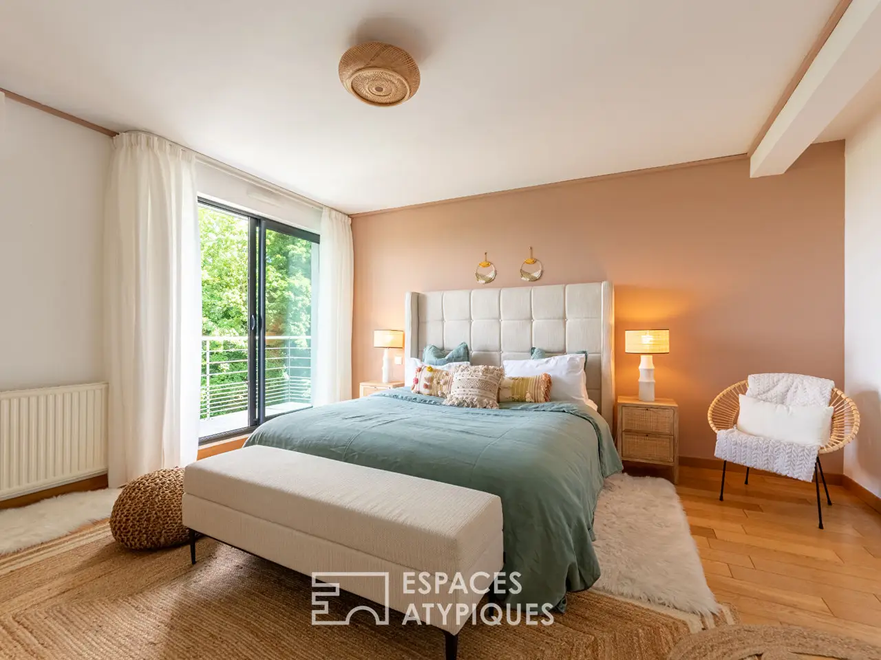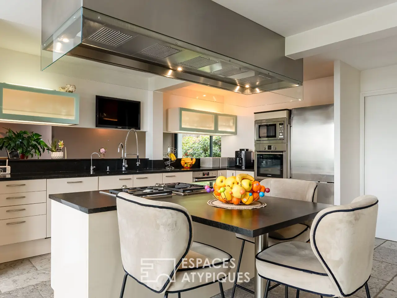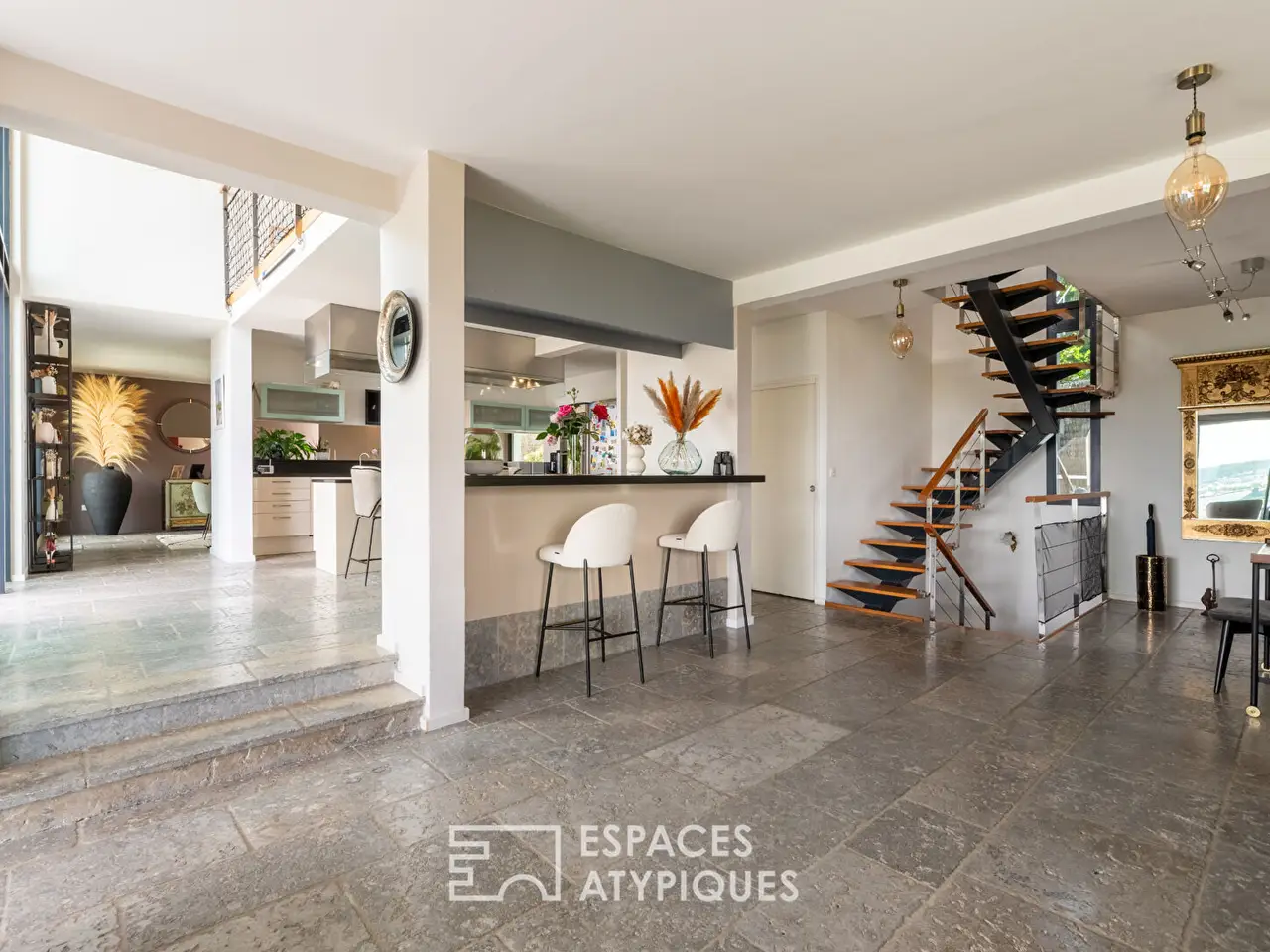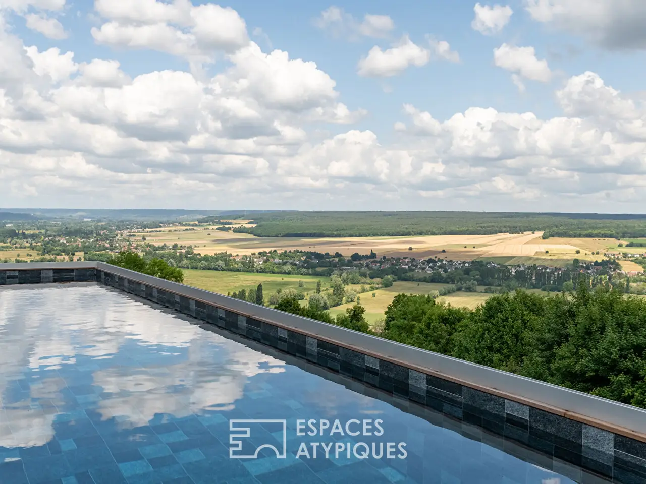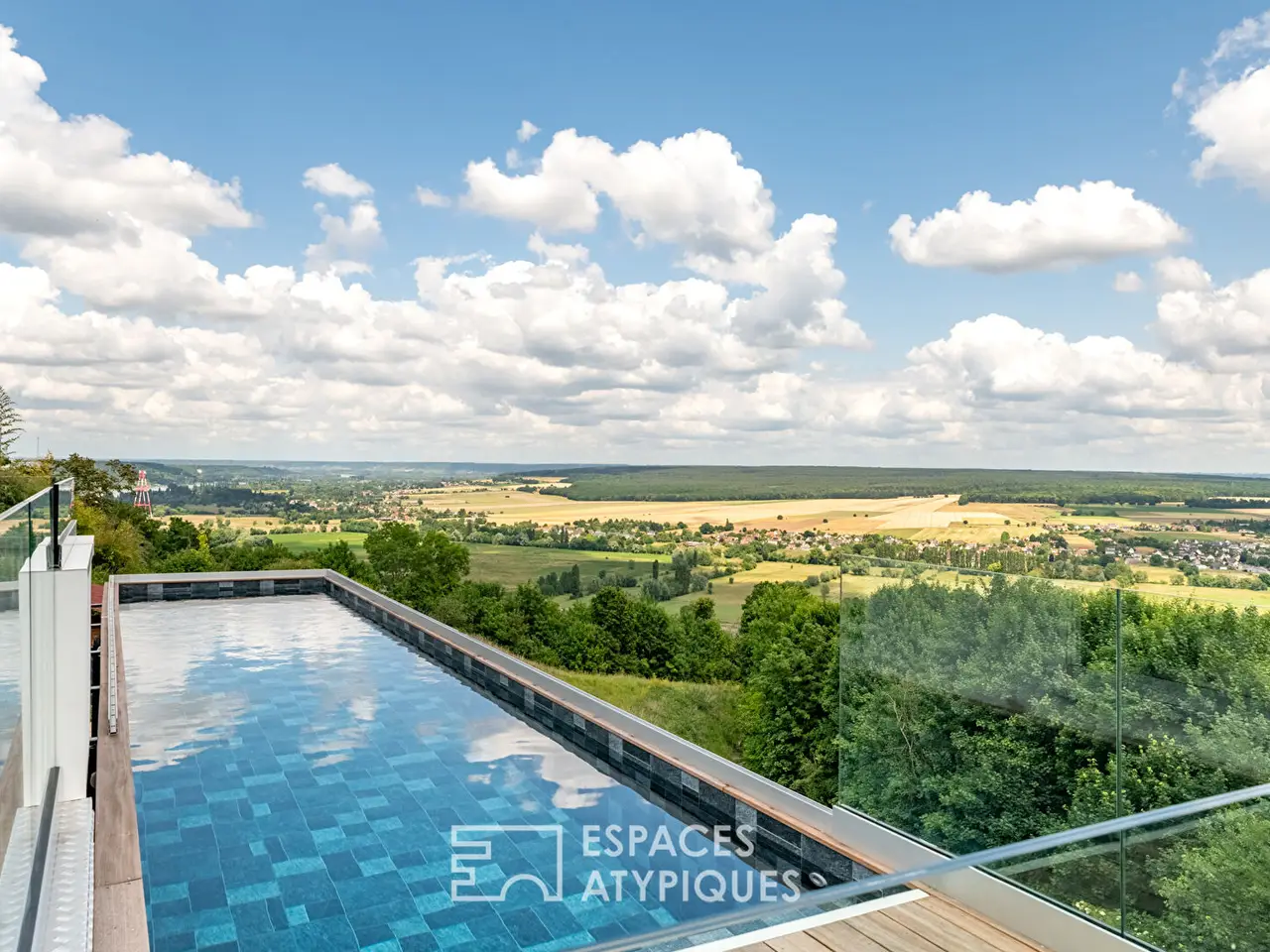 Located on the heights of La Bouille, this 294 m2 contemporary house sits on a 1,800 m2 plot. Its cubic design and clean lines make it a striking architectural achievement, designed to fully embrace the landscape thanks to large bay windows and several terraces with panoramic views of the Seine Valley. Spread over three levels, the house is organized around a dual-aspect living space on the ground floor, entirely clad in Burgundy stone. The open-plan kitchen with a central island and professional range hood opens onto a dining room and a bright living room, structured around a fireplace and a unique view of the river. A 44 m2 terrace with a swimming pool, suspended above the valley, extends the interior space and offers an exceptional visual and sensory experience. Upstairs, the sleeping area includes a large 39m2 landing, a master suite with a dressing room and bathroom, and two additional bedrooms. On the garden level, there are two additional bedrooms with bathrooms, as well as an office. This level also features a laundry room, a cellar, and a closed garage that can accommodate two to three vehicles. In a quiet location, 5 minutes from the A13 motorway and 15 minutes from Rouen, this house with its distinctive architecture offers a privileged living environment combining nature, modernity, and accessibility. Information on the risks to which this property is exposed is available on the Georisques website: www.georisques.gouv.fr ENERGY CLASS: C / CLIMATE CLASS: A Estimated average annual energy expenditure for standard use, based on 2021 energy prices: between €3,220 and €4,440. REF. 11335EAR Additional information * 8 rooms * 5 bedrooms * 3 bathrooms * Floor : 3 * 3 floors in the building * Outdoor space : 1800 SQM * Parking : 2 parking spaces * Property tax : 4 445 € Energy Performance Certificate Primary energy consumption c : 153 kWh/m2.year High performance housing