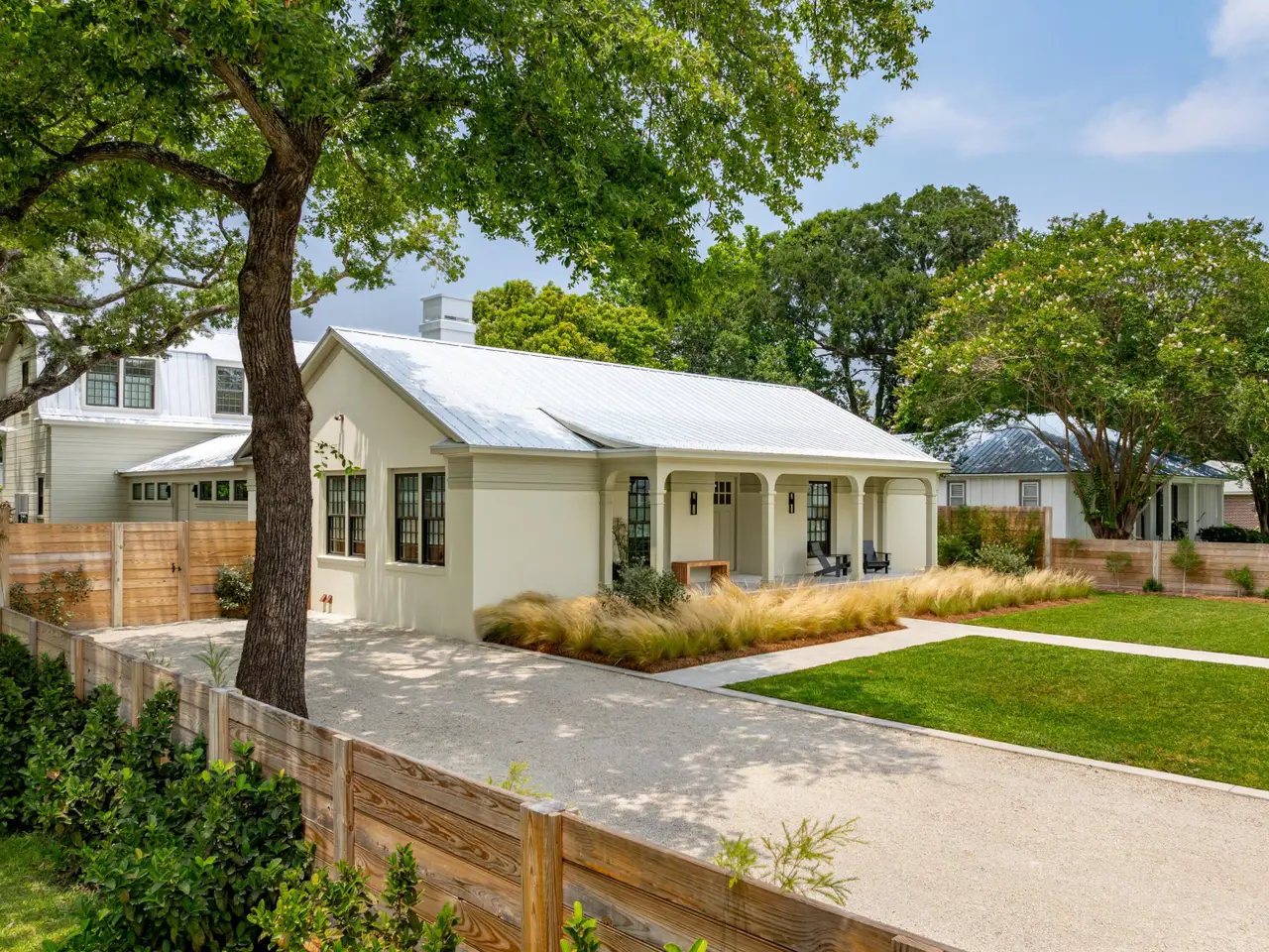 Set on a quiet cul-de-sac in Old Mt Pleasant is one of the finest custom homes you will find in the area. Subtle yet sophisticated, 922 Kincade offers bespoke luxury for those with refined taste. Built with proportion and flow in mind the home appears as a simple ranch in the front but soon the lines of landscaping and the curves of the porch arches draw you in closer and you notice a hyphened estate with multiple courtyards interconnected by sprawling living and entertaining spaces. Spanning nearly four thousand square feet and set on nearly a third of an acre this home has plenty of space but it really benefits from an abundance of privacy that the layout of the home on the oversize lot provides.With immediate curb appeal you can tell 922 Kincade isn't your average new build in Old Mt Pleasant. The stucco and custom sapele arches on the front blend perfectly with the metal roof and modern fixtures and lowcountry landscaping. The front portion of the home benefits from 10 inch reclaimed heart of pine floors, vaulted ceilings, and exquisite millwork throughout. This space serves as the primary entertaining area with the kitchen, living and dining room up front. The high end appliances, custom maple island, and designer grade light fixtures are gorgeous but don't overshadow the craftsmanship that went into the space where the architectural design and natural materials do most of the talking. This space is finished off with a scullery, a half bath and a small office. You have the option to entertain on the front porch, in the central courtyard, or flow back to the rear of the home giving the owners multiple options to choose from. The front house hyphens off down a gorgeous hallway towards the back house. This wide hallway accentuates the large courtyard to the right and another private entry and courtyard to the left. The hall is appointed with concrete floors and lots of glass giving the space a moody and dramatic feel with the natural materials benefitting from the sun pouring through. The flow of this space from front to back and side to side is what sets it apart. Once you are in the back house you have a more relaxed family room / play room with access to a rear courtyard. The first floor also benefits from 2 bedrooms and a central laundry. Upstairs you will find the spacious master bedroom as well as another guest room. All bedrooms have their own ensuite bathroom where the finishes and natural materials shine. Throughout the entire back house the exquisite millwork benefits nearly every wall while high end light fixtures, upgraded hardware, and custom iron railings tie in to give the space a modern feel yet keep the space warm and relaxing. Outside you have a 400 square foot shed that was built with the ability to convert it into a full mother in law suite or keep it as an "over built" shed and golf cart parking. This shed can be accessed from the back courtyard or the central courtyard. Both courtyards would be more than suitable to build a custom pool if you so choose. The central courtyard would be ideal for a pool as it benefits from a large covered porch with access from both the back and front houses as well as the connecting hallway making entertaining a breeze. The flow of the home can not be understated. Set up to entertain and expand and contract based on need the home has so many options to utilize for any activity. If you have an eye for detail and appreciate craftsmanship and architectural design, this home is the perfect match of sophistication and Lowcountry living at its best.