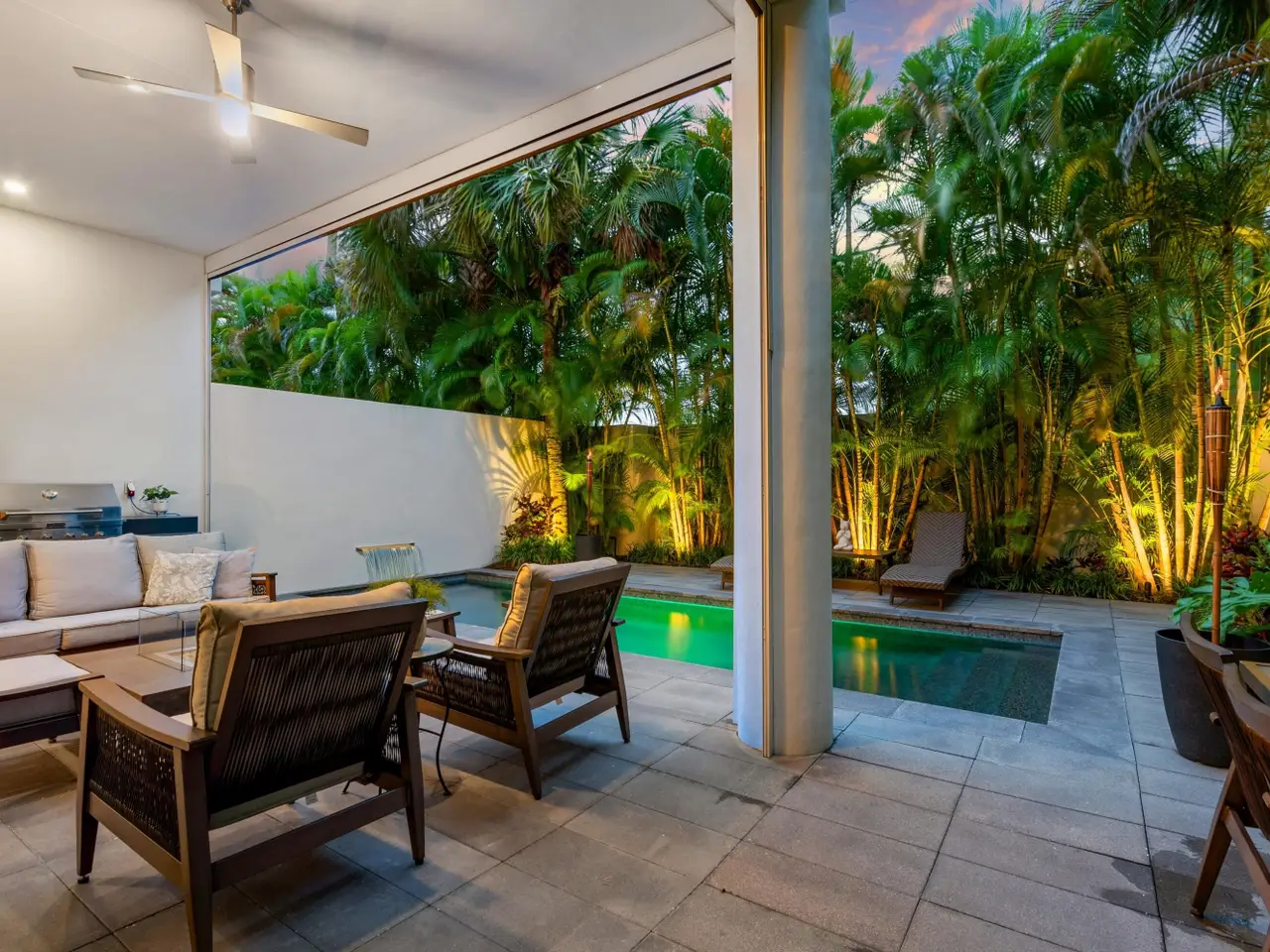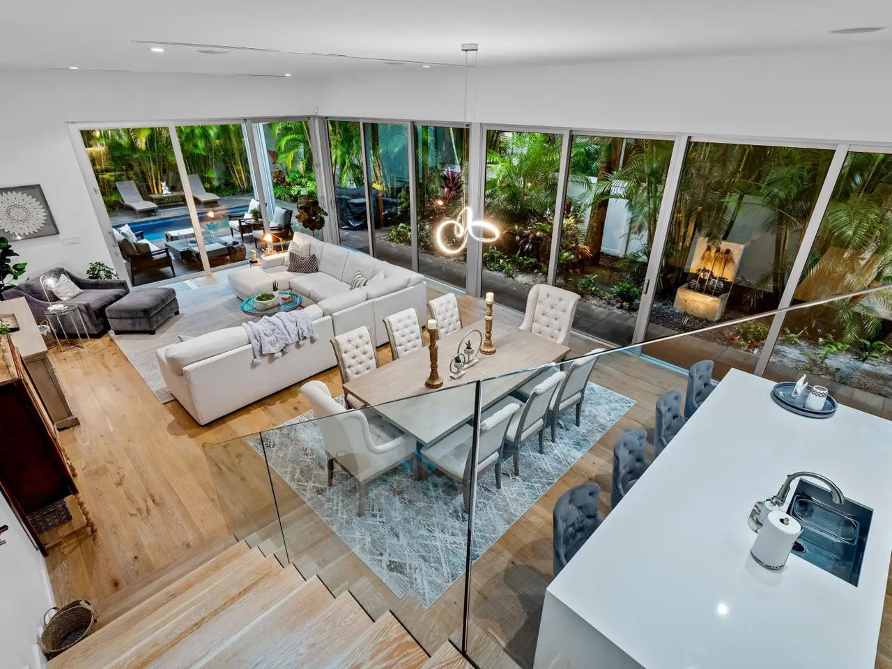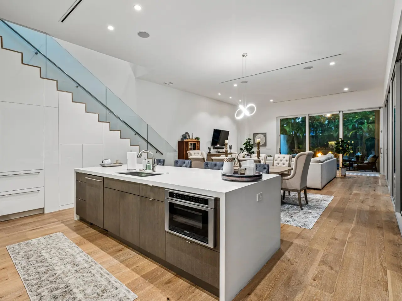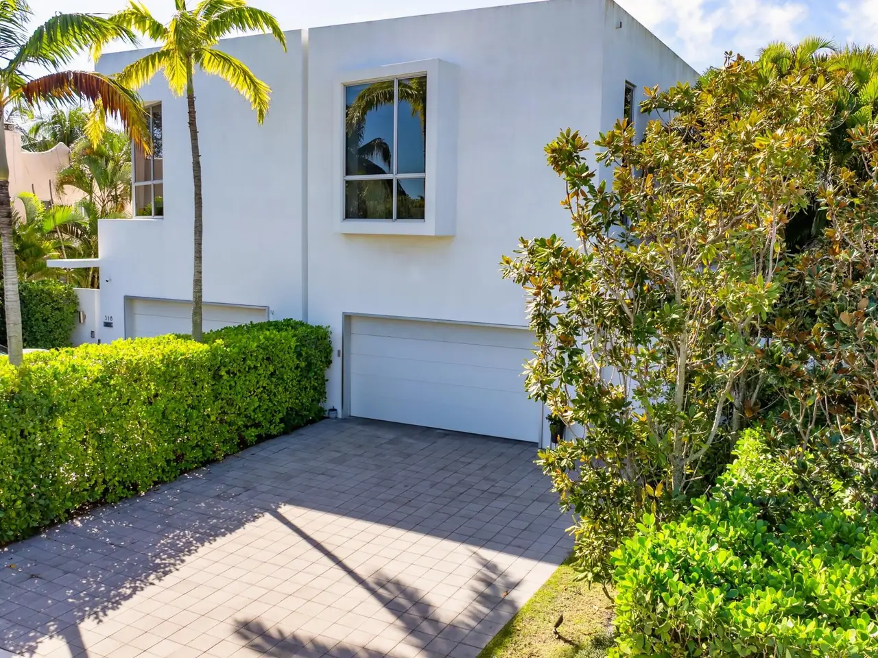 Near Atlantic Avenue and the ocean, this chic custom townhome, with no HOA, features a stunning open floorplan in a unique configuration that creatively elevates the living, dining and kitchen areas into one open, airy living space. Details include walls of glass offering garden and pool-patio views, custom cabinetry, and an outdoor entertaining area set within beautiful tropical landscaping.