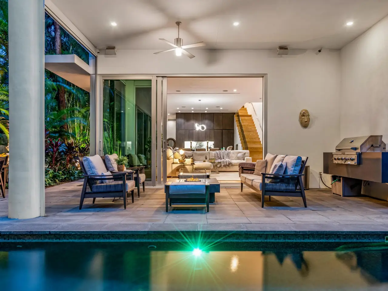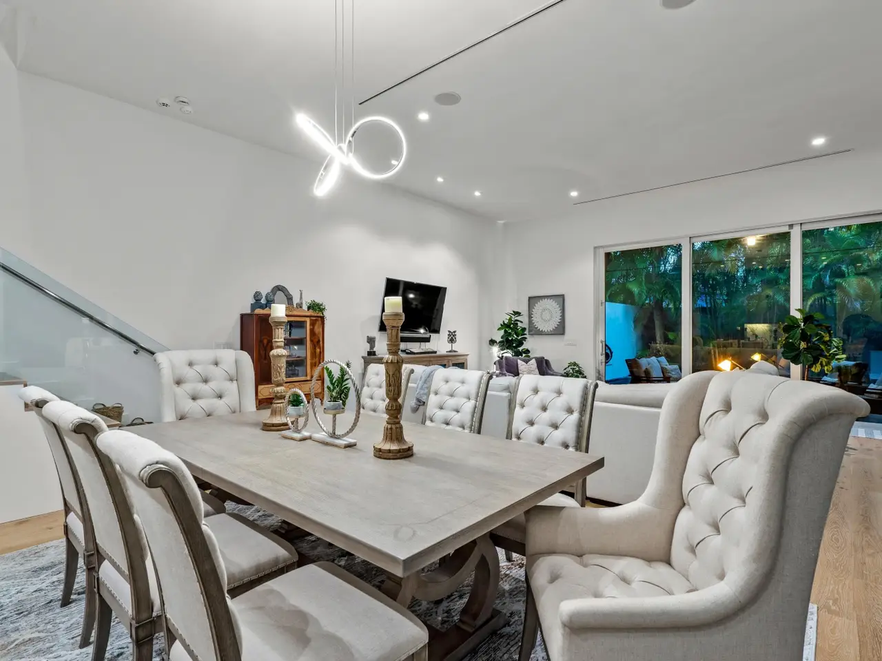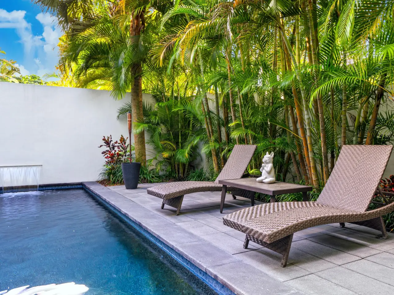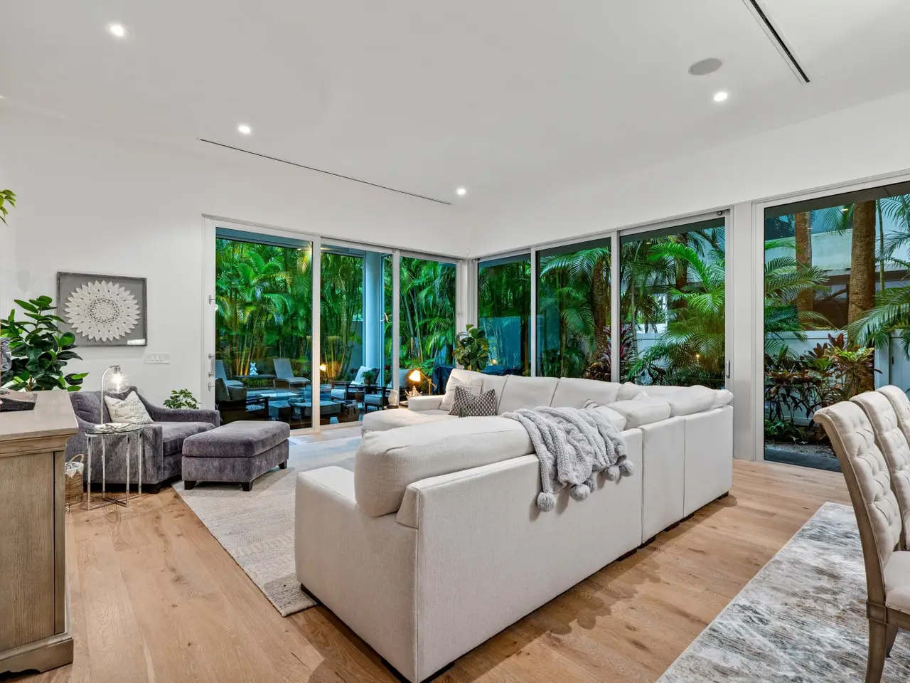 Near Atlantic Avenue and the ocean, this chic custom townhome, with no HOA, features a stunning open floorplan in a unique configuration that creatively elevates the living, dining and kitchen areas into one open, airy living space. Details include walls of glass offering garden and pool-patio views, custom cabinetry, and an outdoor entertaining area set within beautiful tropical landscaping.