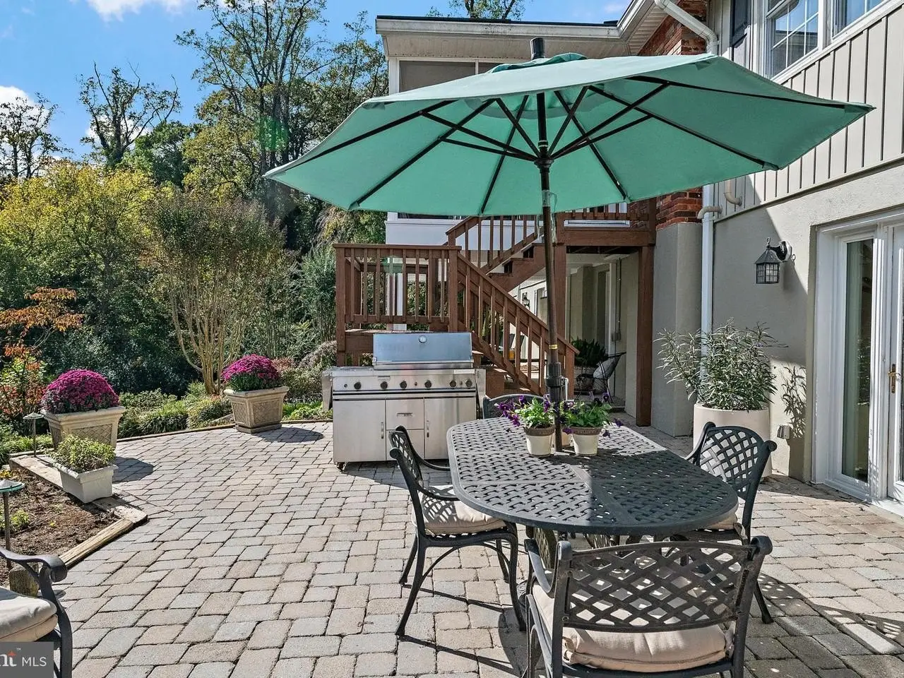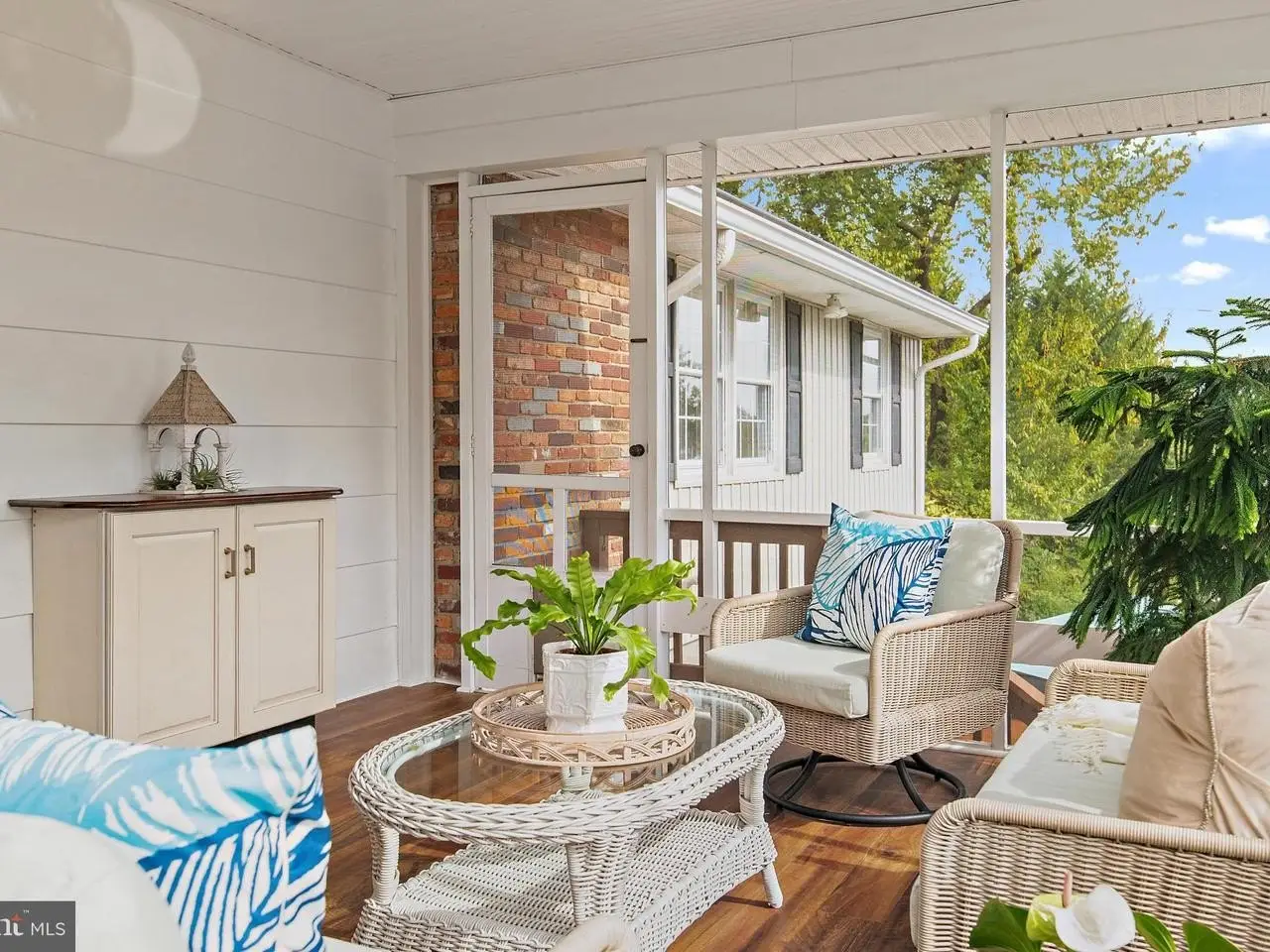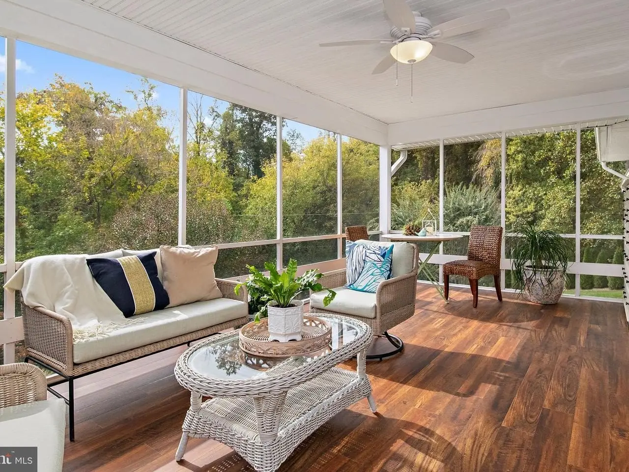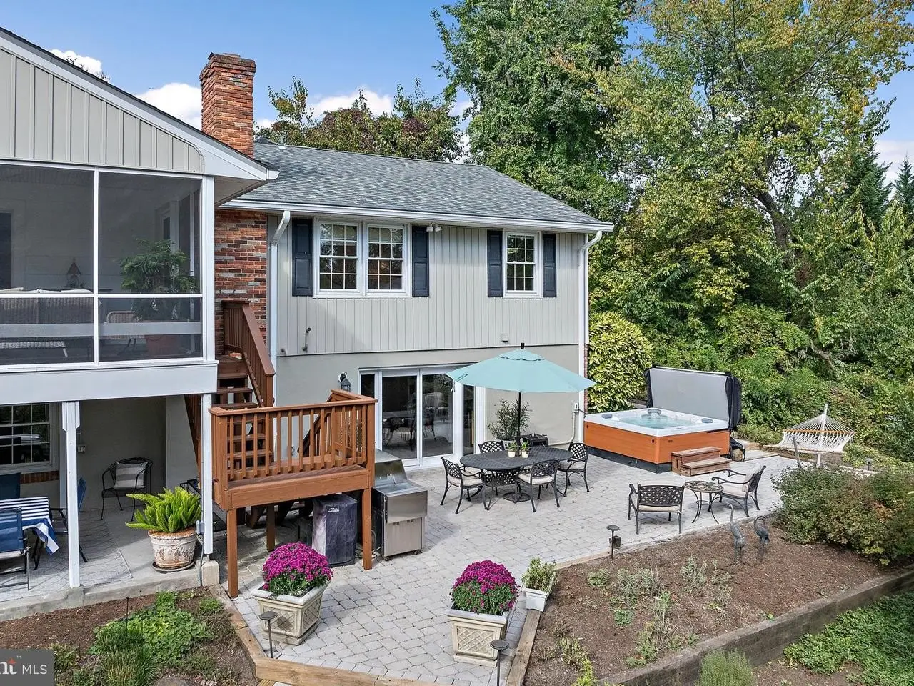 Screened porch overlooking landscaped backyard