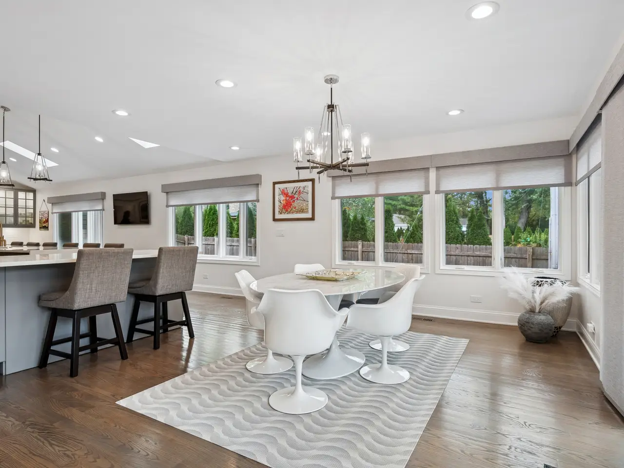 Impeccably renovated and thoughtfully upgraded, this 4,225 sq. ft., 4-bedroom, 5-bathroom home in northern Highland Park perfectly blends modern luxury with timeless design. Taken down to the studs during a complete 2019-2020 renovation, the home offers all-new systems including HVAC, plumbing, roof, and appliances, providing move-in-ready peace of mind. The main level showcases an elegant open layout anchored by a showstopping chef's kitchen with a 15-foot island, Sub-Zero refrigerator/freezer, Wolf six-burner range with dual ovens, Bosch dishwasher, Thermador drawer microwave, beverage refrigerator, and farmhouse sink. Recent enhancements include Waterstone brushed brass fixtures and matching luxury hardware. Red oak hardwood floors in a modern gray finish run throughout, with recessed lighting, Lutron dimmers and custom Hunter Douglas motorized blinds to enhance both comfort and sophistication. The upper level features a luxurious primary suite with vaulted ceilings, a spa-quality bath, and generous closet space, while each additional bedroom includes a private full bath. A third-floor laundry room adds convenience, and the finished lower level offers flexible living space for a recreation room, gym, or fifth bedroom. A Trex deck with built-in lighting and a natural gas fire table creates a seamless indoor-outdoor flow. Additional highlights include Nest thermostats, a SimpliSafe security system, a spacious mudroom with built-ins, a fully fenced backyard, and an attached two-car garage. Ideally situated near parks, restaurants, the train station, and Fort Sheridan's scenic lakefront trails, this home offers the best of Highland Park living.
