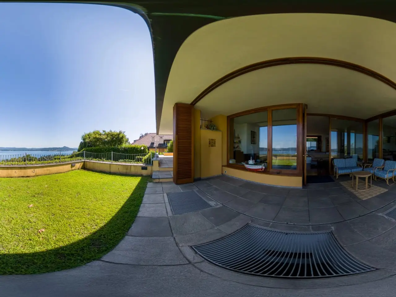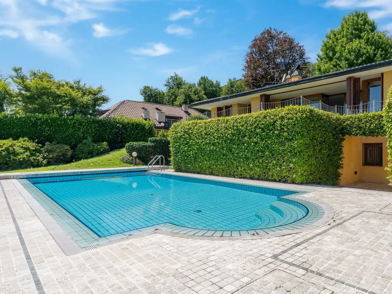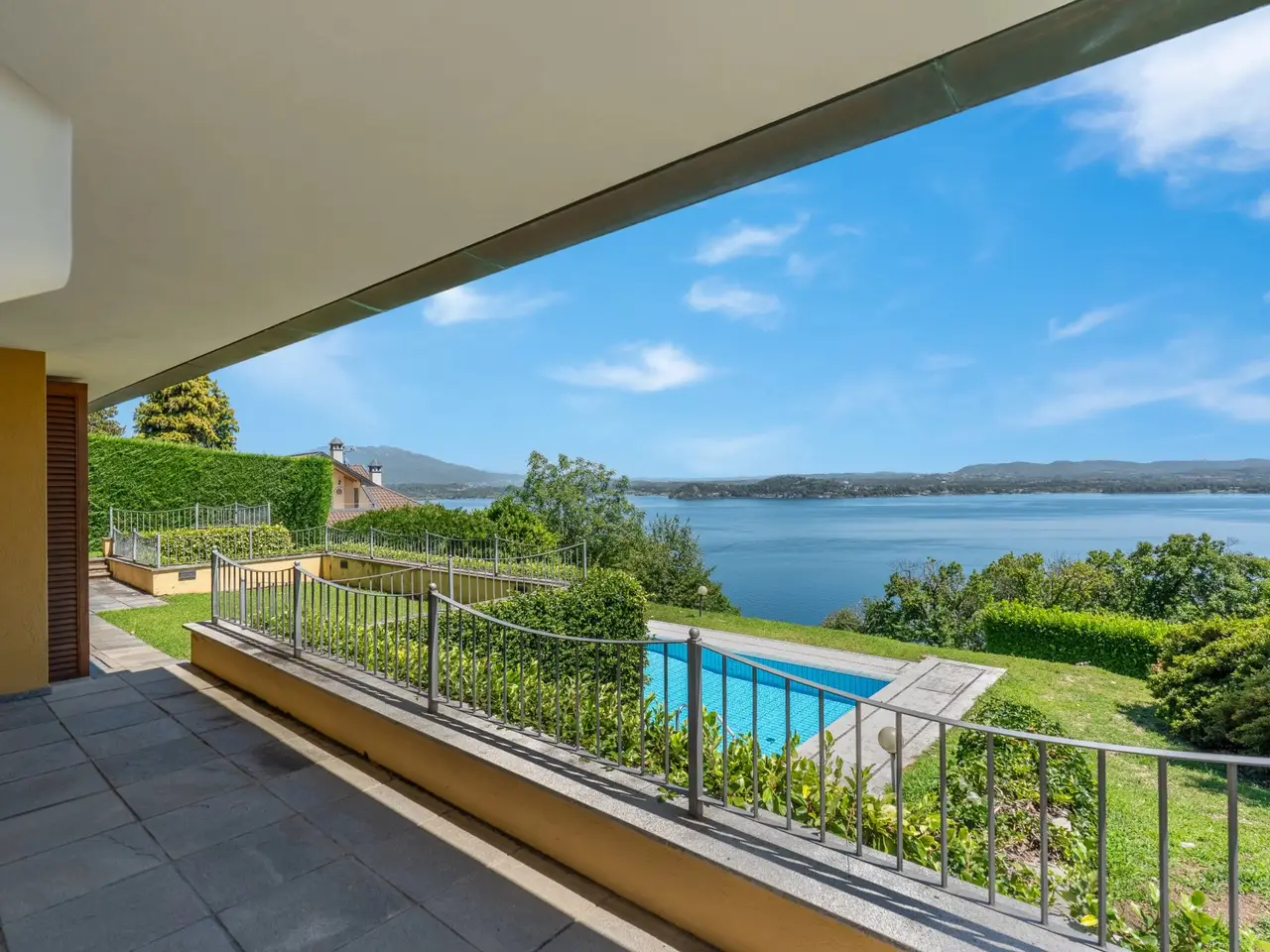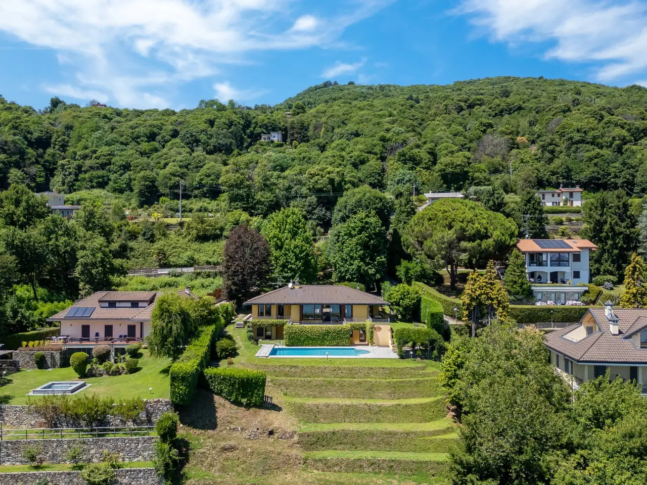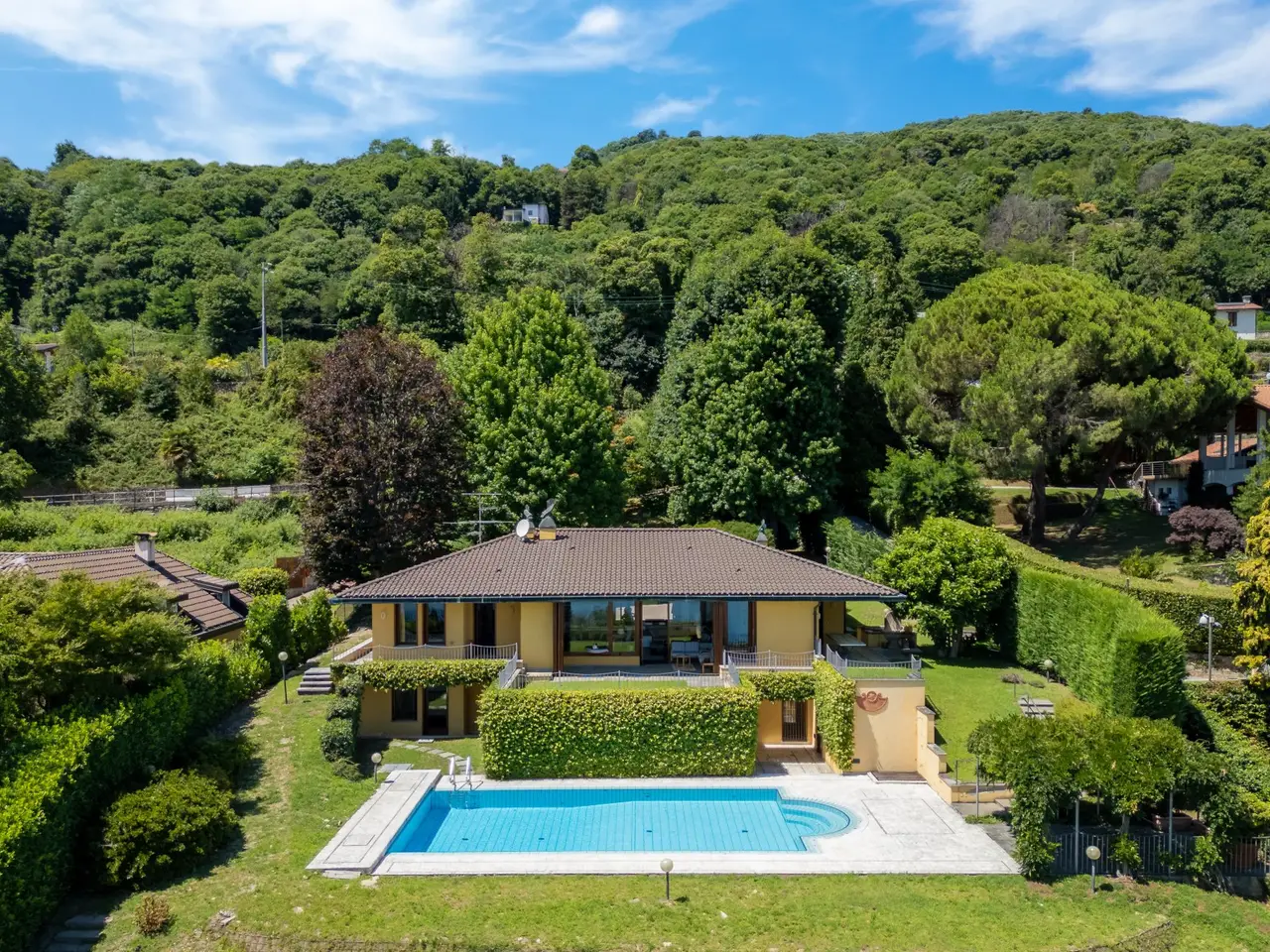 In a panoramic and private location on the hills of Lesa, we offer for sale a modern villa with breathtaking lake views, surrounded by a private park of about 3,700 sqm. The property is located in one of the most exclusive residential areas of Lake Maggiore, a few kilometers from the center, in an ideal location for those seeking tranquility, privacy and a representative residence. Main features of the villa on the mezzanine floor: - Main floor all on one level, ideal for enjoying the integrated convenience of space. - Large living room with panoramic windows overlooking the lake, connected to the dining area - Eat-in kitchen with adjacent workspace/den area - Master bedroom with en suite bathroom - Second master bedroom with en suite bathroom and walk-in closet - Courtesy bathroom for guests Ground floor: - Large tavern with fireplace - Third bedroom with en suite bathroom - Additional kitchenette, ideal for guests or staff - Study, technical rooms and various storage spaces (laundry, storage, etc.) Exterior and amenities: - Private pool with sunbathing area - Panoramic terraced garden of about 3,700 sq. m. - Pergola with wisteria ideal shaded area to create a barbecue adjacent to the pool and lake view terraces - Double covered garage and large porphyry-paved courtyard - Irrigation system, outdoor lighting, automatic gate, alarm system. This villa for sale in Lesa is perfect as a first home or vacation residence. The commanding location offers spectacular views of Lake Maggiore, while the spacious interior and exterior spaces make it ideal for families as well.