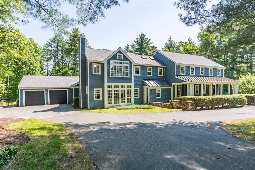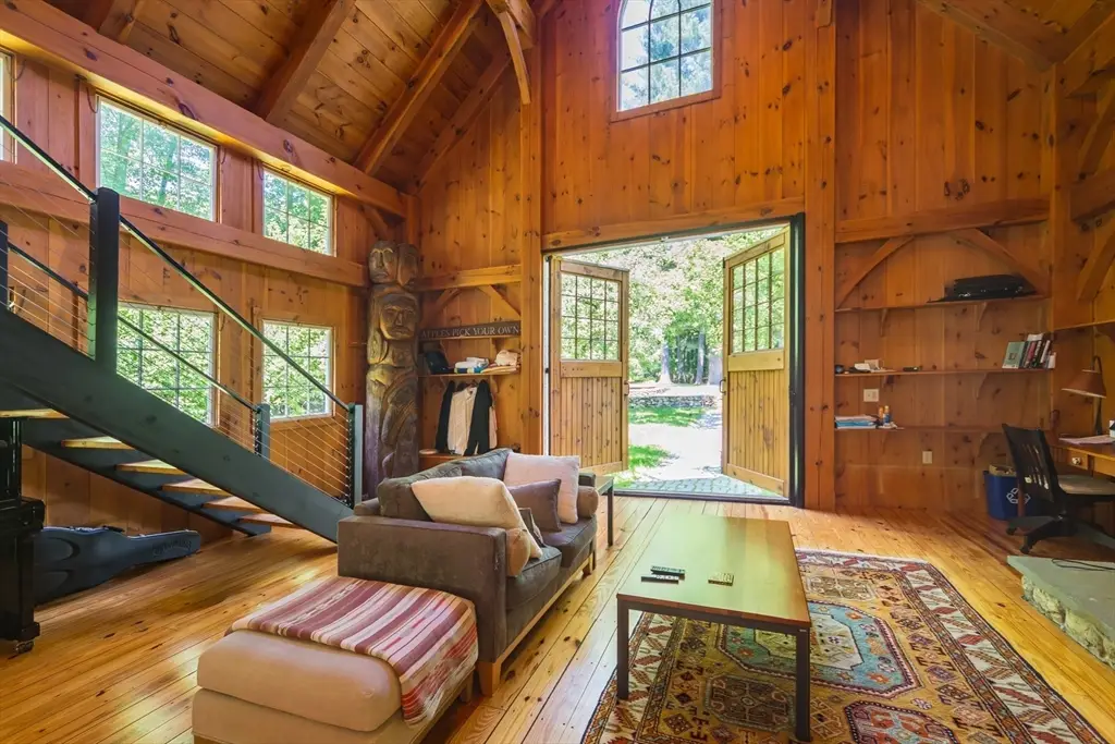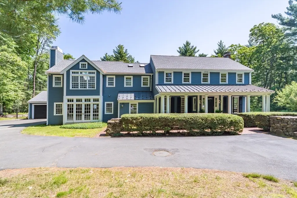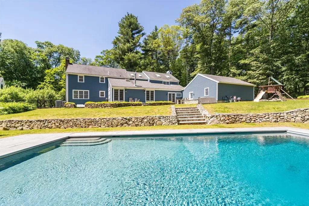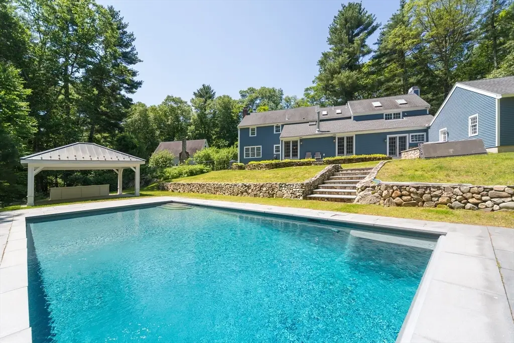 Nestled along a quiet country road, this stunning property offers the perfect blend of rustic charm and refined living. This beautifully crafted home exudes warmth and character. Lots of windows and French doors bring the outside in. The chef's kitchen boasts a fireplace, butler's pantry, large island, and gas cooking. The mud room is huge with plenty of closet space and shelves. The first floor office has its own entry, with a bath nearby. Main bedroom has a cathedral ceiling and another fireplace. The very private outdoor living space includes a saltwater pool that is just steps away from the patio and a year-round spa. Offering separate additional living space is a VERY COOL 3 Level Circle B barn, with a stone fireplace, open living area, a loft, and a lower level to accommodate 2 horses. The professionally landscaped grounds are accentuated with cobblestone and brick pathways, and direct trail access. All this and one of Massachusetts best school systems!!