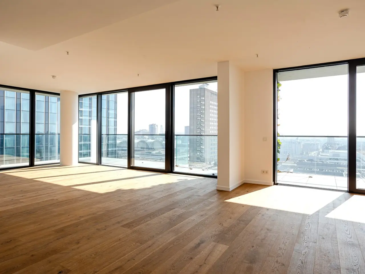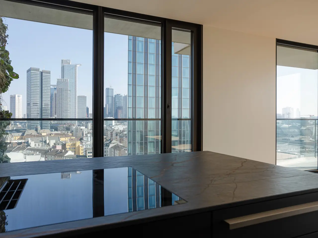 This premium apartment is located on the 14th floor of EDEN, one of the tallest residential towers with a green façade in Europe. The transparent architecture with vertical greenery and floor-to-ceiling panoramic windows offer airy living and spectacular views of the skyline and the south of Frankfurt. The elevator takes you to the 14th floor. You enter the apartment via a modern, open entrance hall. The impressive living area with a view over Frankfurt and the open-plan designer kitchen with cooking island, in elegant, dark materials, present themselves with plenty of light and glass. A large sliding door leads to the balcony with surrounding glass balustrade and a magnificent view over Frankfurt and the skyline! The master bedroom with en suite bathroom and three further bedrooms/study rooms, each with access to the balcony, offer state-of-the-art living space. A total of two modern bathrooms are assigned to the three rooms. One of the rooms has a walk-in dressing room. The inviting, prestigious lobby and the in-house gym are located on the first floor of the building. The 24-hour concierge service is another highlight of this elegant apartment. Two underground parking spaces included round off this exceptional offer. The apartment is ideal for couples as well as for a family with two to three children who appreciate urban living in EDEN as a green oasis combined with maximum living comfort in the heart of the city.