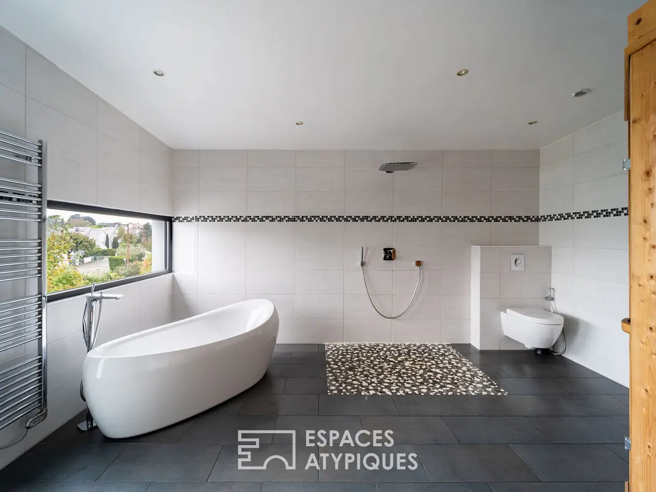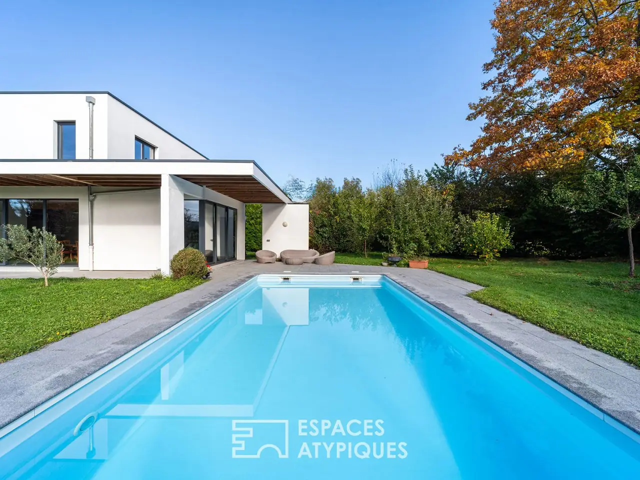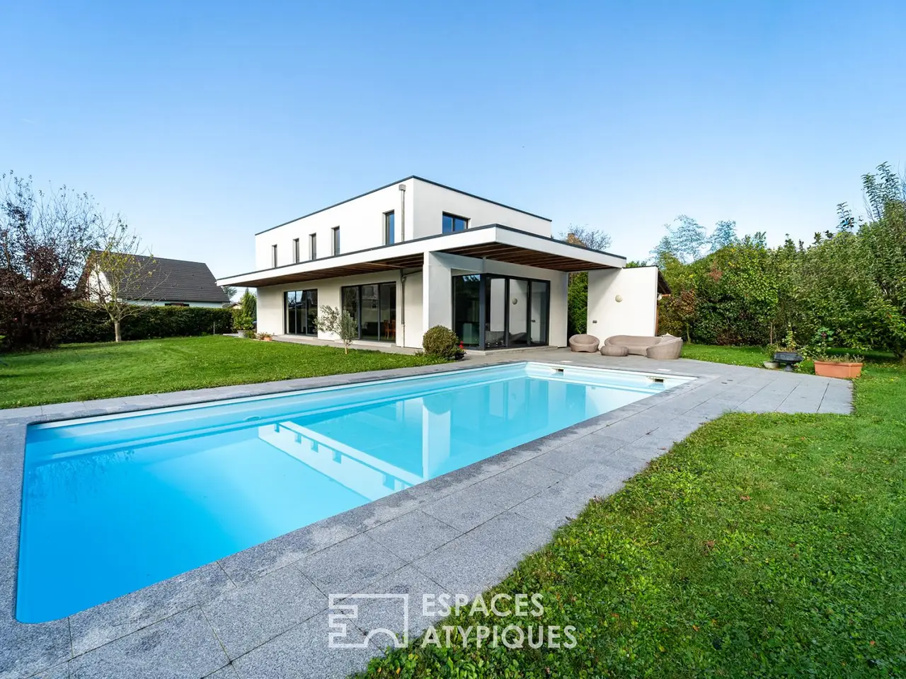 Situated in a peaceful setting just 25 minutes from Strasbourg, this sleek architect-designed villa spans 250 m2. Built in 2011, it sits in 15.7 acres of wooded grounds with a 10 x 4.5 m heated swimming pool. Designed to offer maximum light, it boasts generous, functional living space for a comfortable family lifestyle. The entrance hall sets the tone for the extraordinary volumes to follow. With 3 m high ceilings, the 60 m2 living room offers an exceptional sense of space and depth. It comprises a lounge and dining room warmed by a wood-burning stove and bathed in light thanks to more than 9 metres of picture windows overlooking the lush garden. Adjoining the dining room is a large, bright kitchen/diner with a central island and granite worktop, offering a pleasant view of the garden and swimming pool, as well as direct access to the terrace. A study opening onto the garden, a shower room and a utility room complete the ground floor. The upper floor is given over to sleeping quarters, with a shower room, a vast bathroom with sauna and four generous bedrooms, one with an adjoining made-to-measure dressing room. A double garage completes the features of this property, which also benefits from high-performance insulation, ensuring comfort and energy savings for its future owners. Its sophisticated lines, functional design and above all its vast green setting in a privileged area make this a particularly rare property that will delight lovers of contemporary purity. REF. 1404 Additional information * 7 rooms * 5 bedrooms * 3 bathrooms * Outdoor space : 1571 SQM * Property tax : 1 554 €