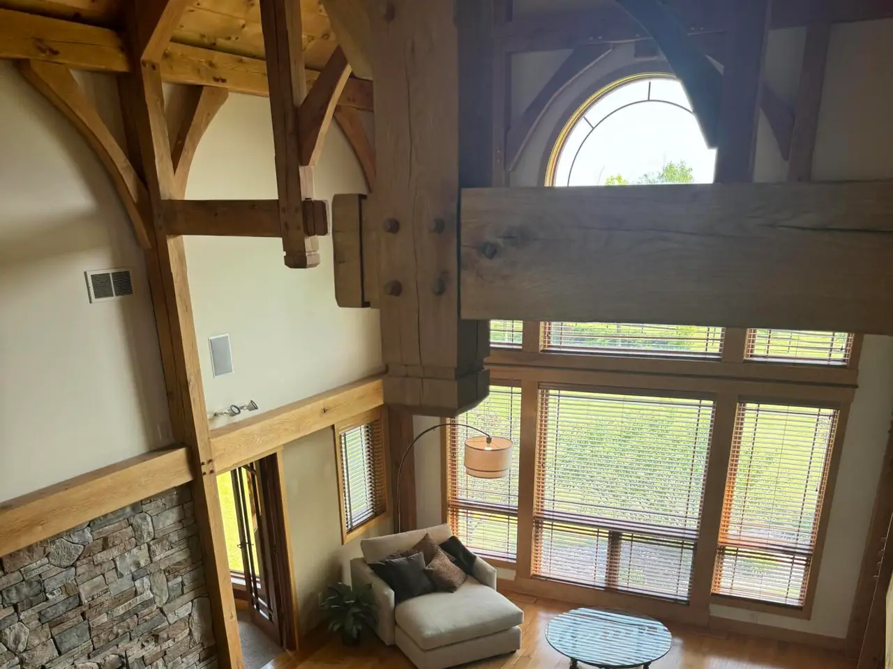 Nestled on a sprawling property, this stunning Timber-frame home offers elegance and modern comfort. With its signature architectural details, exposed beams, wide overhangs, and handcrafted woodwork, this residence exudes charm and craftsmanship. The expansive lot is a nature lover's paradise, offering privacy, lush landscaping, room for horses (or other animals) and plenty of space for outdoor living. Warm hardwood floors and large windows that flood the space with natural light. The gourmet open kitchen features a large center island, a cozy breakfast nook and a formal dining room. The spacious living areas, complete with a stone fireplace and coffered ceilings, create an inviting atmosphere for family gatherings. See new carpet installed! Scroll for updated pictures at the end.