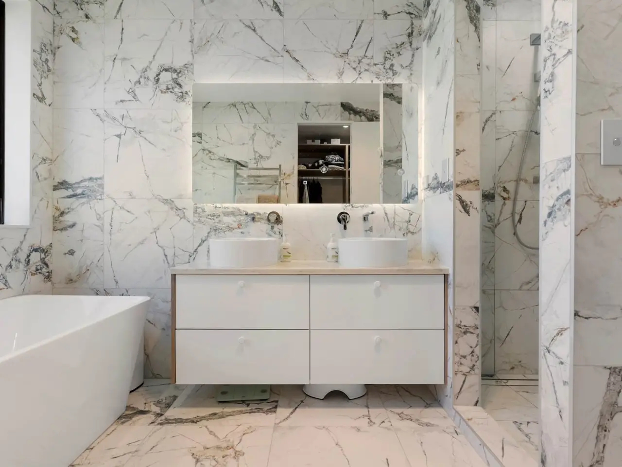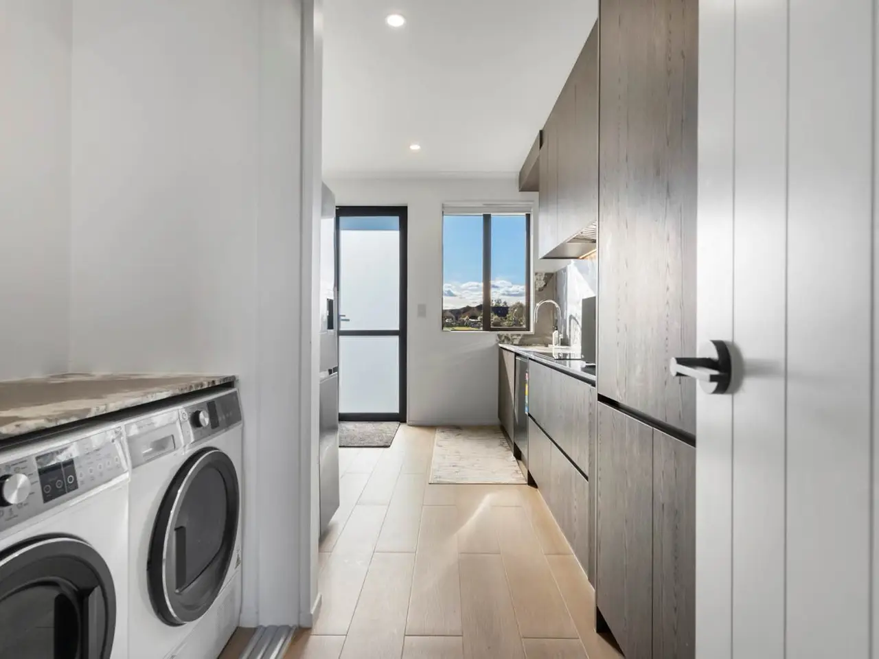 Open plan kitchen with engineered stone bench