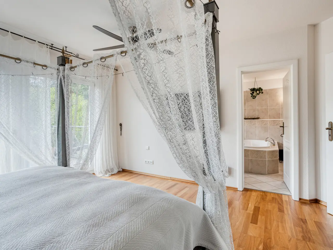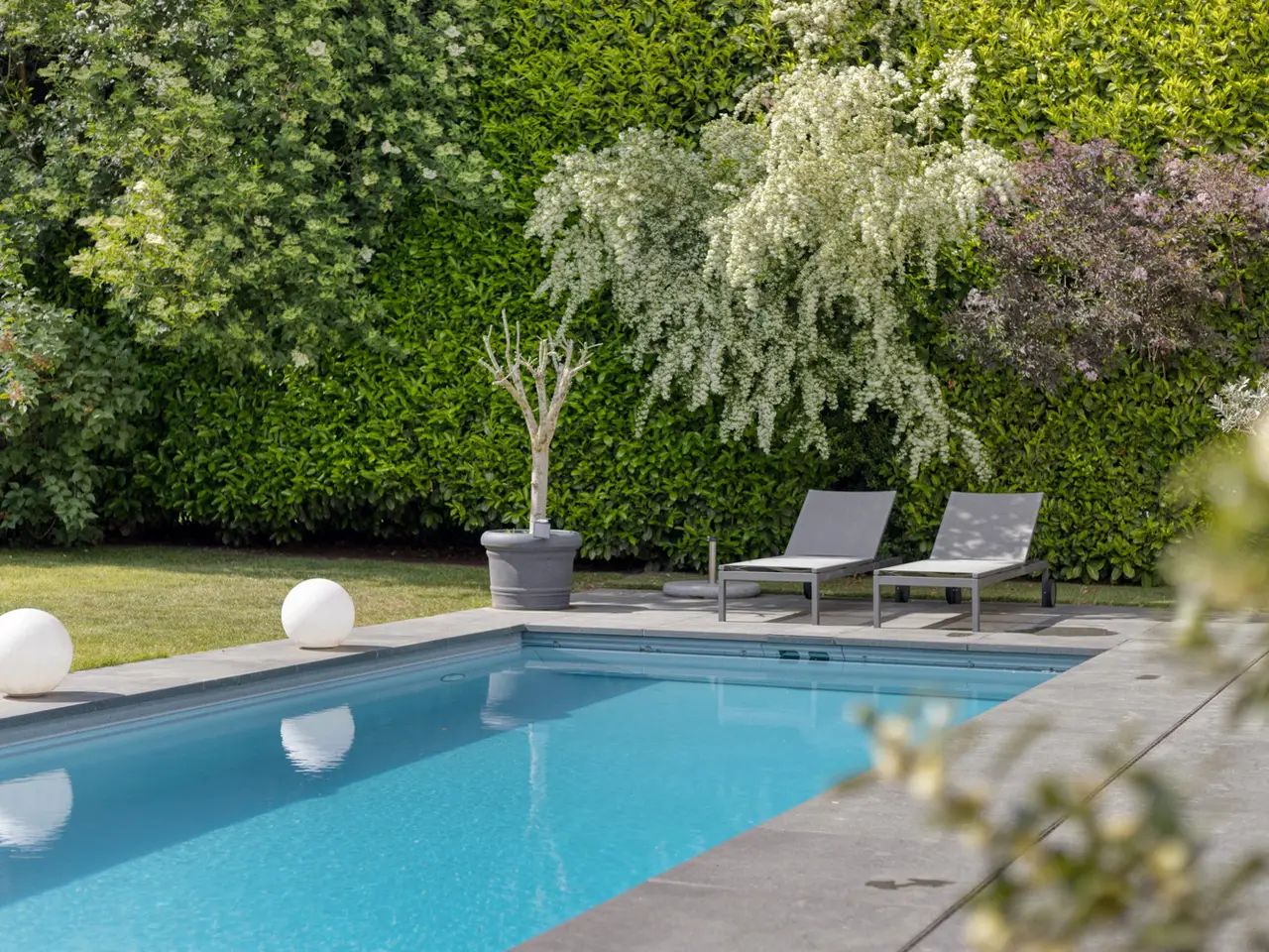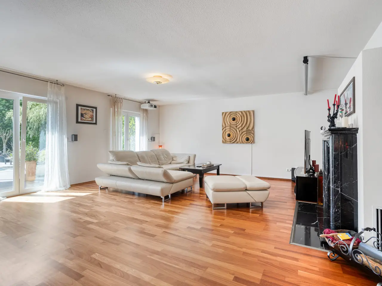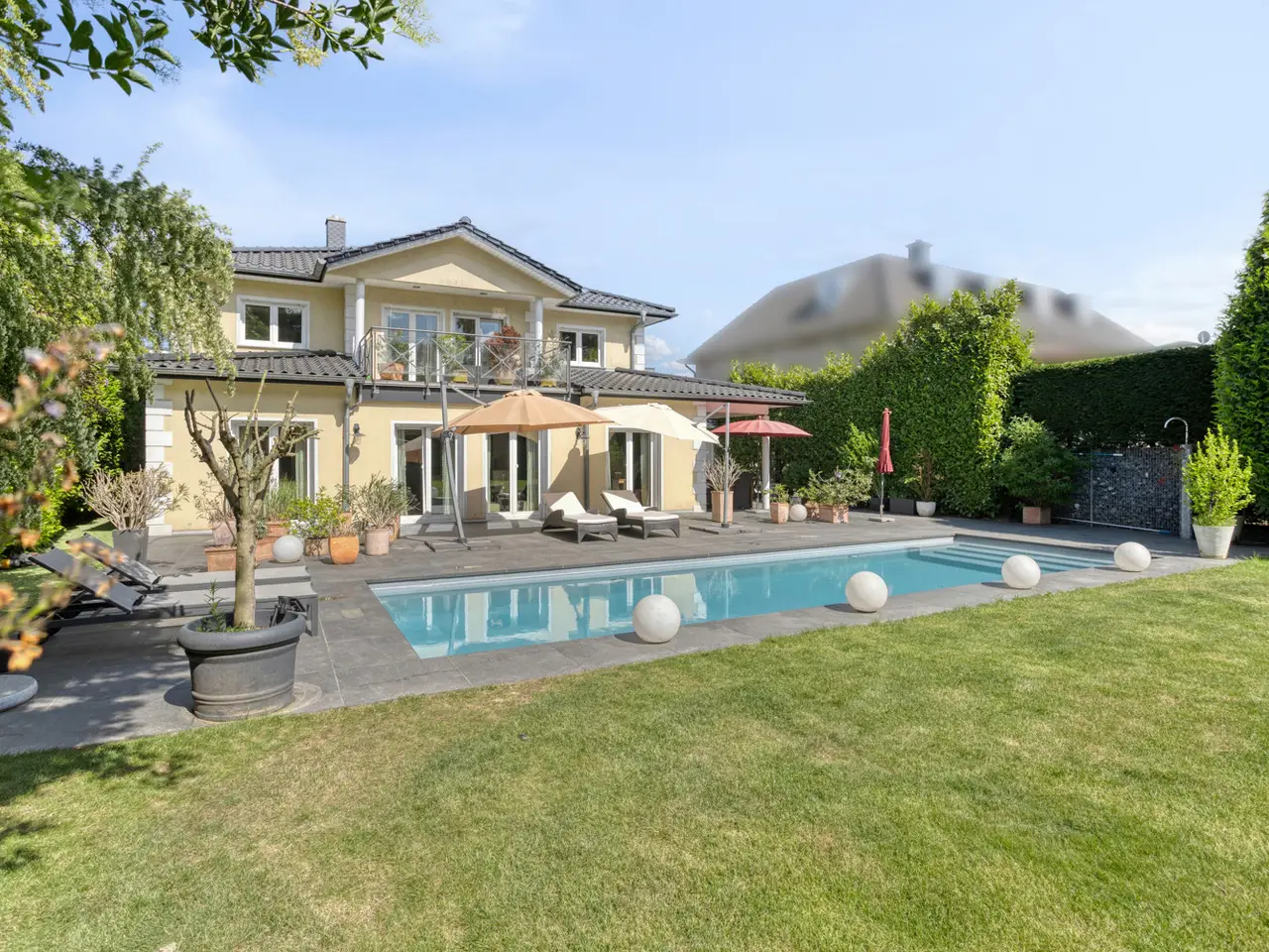 Bring your vacation home, because this villa, built in 2007 on a plot of around 1,175 m², now offers you living at the highest level on approx. 274 m² of living space and a total of 6 rooms, with the heated outdoor pool, the spacious terrace areas and the secluded garden providing a vacation feeling almost all year round. State-of-the-art building technology with fuel cell heating and a photovoltaic system with storage also ensure outstanding energy efficiency. You enter the house via the partially paved front garden, which is enclosed by a fence and wall, through a prestigious reception area into the spacious entrance hall, from where your gaze falls directly onto the high ceilings and the open gallery on the upper floor. From the entrance hall, you enter the kitchen on the left and the guest area with bedroom, small hallway and en-suite shower room on the right. The loft-like living and dining area with around 63 m² of living space is located in front of you. Here, the large marble fireplace creates a cozy atmosphere in winter, while the 5 floor-to-ceiling windows offer a seamless transition to the spacious pool area and garden in summer. This creates interesting axes of light and views, all of which lead through large window fronts into the surrounding garden and pool area. The large terrace by the outdoor pool and a covered outdoor seating area to the side of the house offer plenty of space to enjoy the beautiful days of the year with family and friends. And if you like it sporty, you will find your opponent in the pool's counter-current system. Solar panels in the pool's electric roller cover help to heat the pool in spring. The kitchen is already equipped with a high-quality country-style fitted kitchen and also has a useful storage room and direct access to the double garage. The open-plan staircase leads to the gallery on the upper floor and from there to the four bedrooms on this floor. The air-conditioned master bedroom has a spacious en suite bathroom with shower and bathtub and access to the balcony on this level. All rooms on both the ground and upper floors can be darkened with electric shutters. In the basement, which has a partial cellar, there is a hobby room and the utility room, which also houses the swimming pool equipment. The garden is densely planted and offers plenty of privacy and is barely visible, and is kept wonderfully green with an irrigation system. Next to the pool, an outdoor shower with warm water provides cooling and a small garden shed provides storage space in the outdoor area. The double garage can also be accessed through the garden. This is equipped with an electric door and offers space for further parking spaces in front of it, which are secured from the street by another door. You can also expect high-quality fittings on all levels of the house. Stone and parquet floors, a high-quality fitted kitchen and modern building technology are just a few examples. We cordially invite you to arrange a viewing appointment on site to see the charm and quality of the property for yourself.
