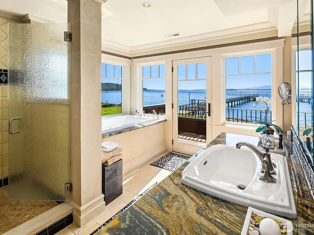 Unrivaled waterfront luxury on Whidbey Islands coveted Mutiny Bay. This gated 1.6 acre estate offers 214' of pristine no bank sandy beachfront with sweeping views of Puget Sound and the Olympic mountains. The private compound includes sophisticated main residence, elegant guest house, and a beautifully appointed carriage house. Impeccable landscaping, expansive entertaining, a shared 400' plus dock for boats, water craft and float plane creates the ultimate retreat. A rare opportunity to own one of the Pacific Northwest finest coastal Estates.