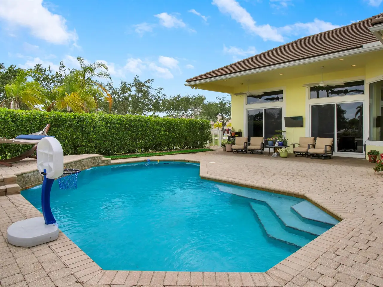 Come see this impressive waterfront pool home located in a gated boating community. This 4 bedroom (plus den/office), 3 bath home is on a deep-water canal with a dock (updated in 2020) and a 13K lift located behind the home with ocean access and no fixed bridges. Great outdoor living with a fenced backyard with an awesome heated saltwater pool and a Tiki Hut with a built-in outdoor style kitchen, lush landscaping and on a corner-lot add to a private setting. The interior of the home is nicely appointed with formal dining and living room and a large combo kitchen and family room. The kitchen comes with stainless steel appliances, 42'' cabinets, granite countertops, double oven, and a center island. Large 3 bay garage allows for good storage. Both A/C units replaced in 2023. Whole house Generac 22kw generator installed in 2020. Easy access to I-95.