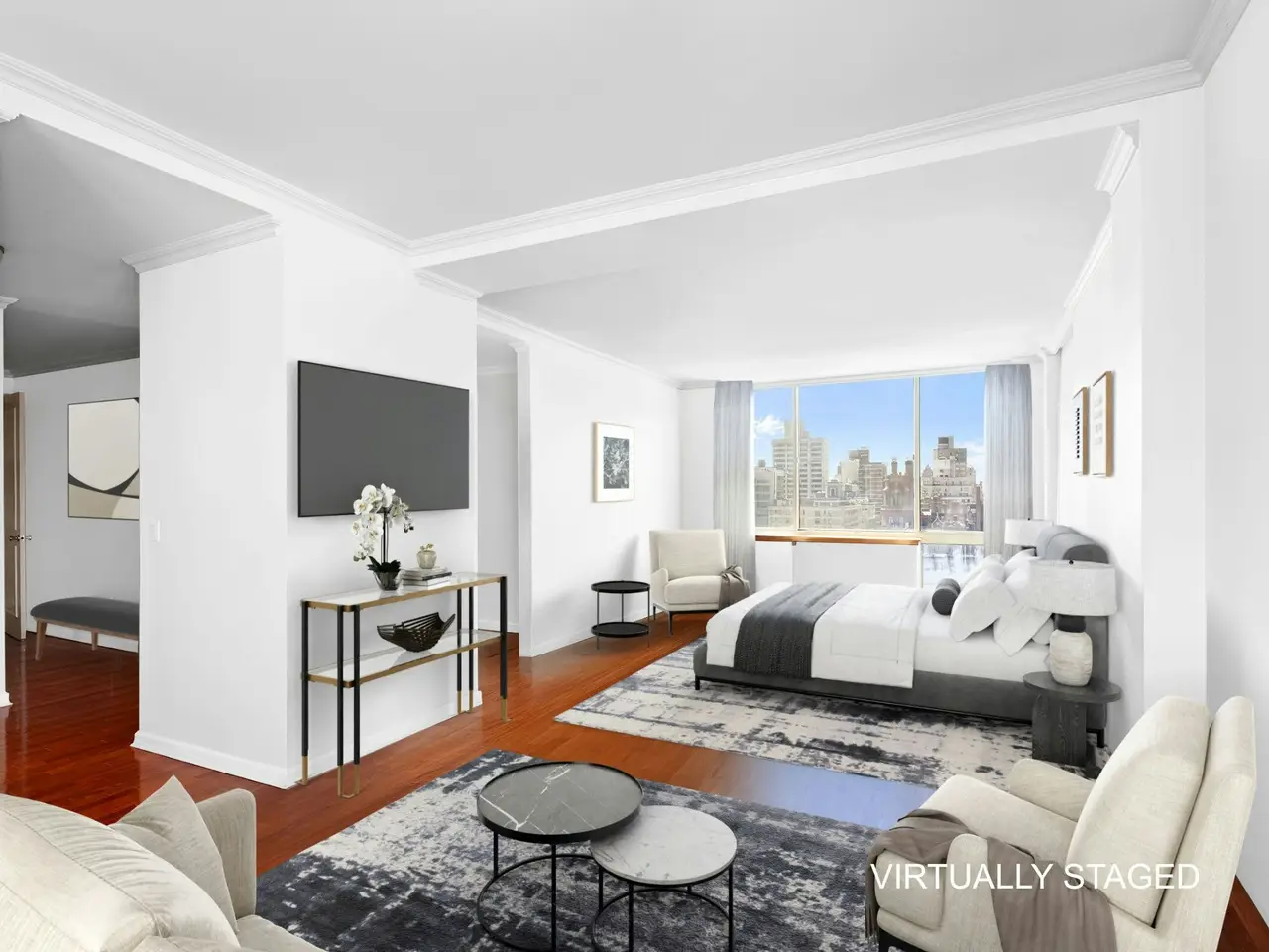 Expansive primary suite with city views