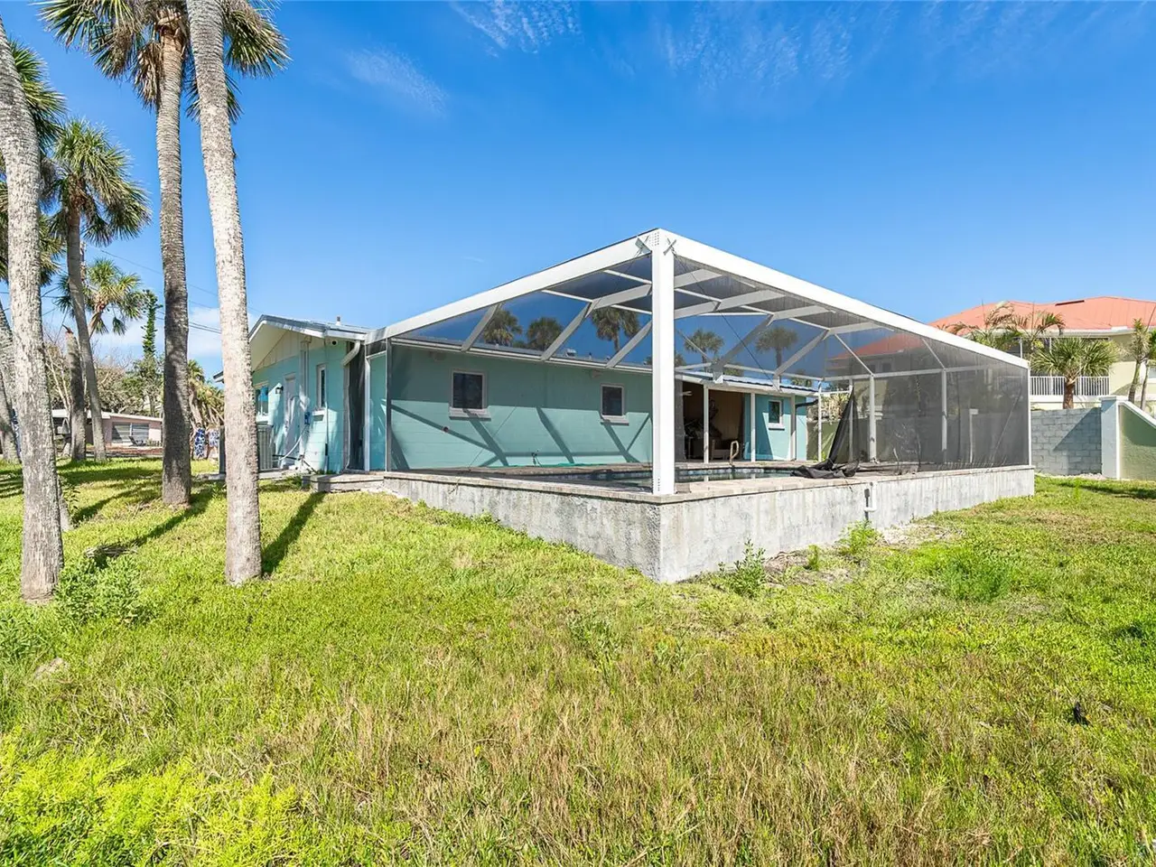 Newly added caged pool with brick pavers