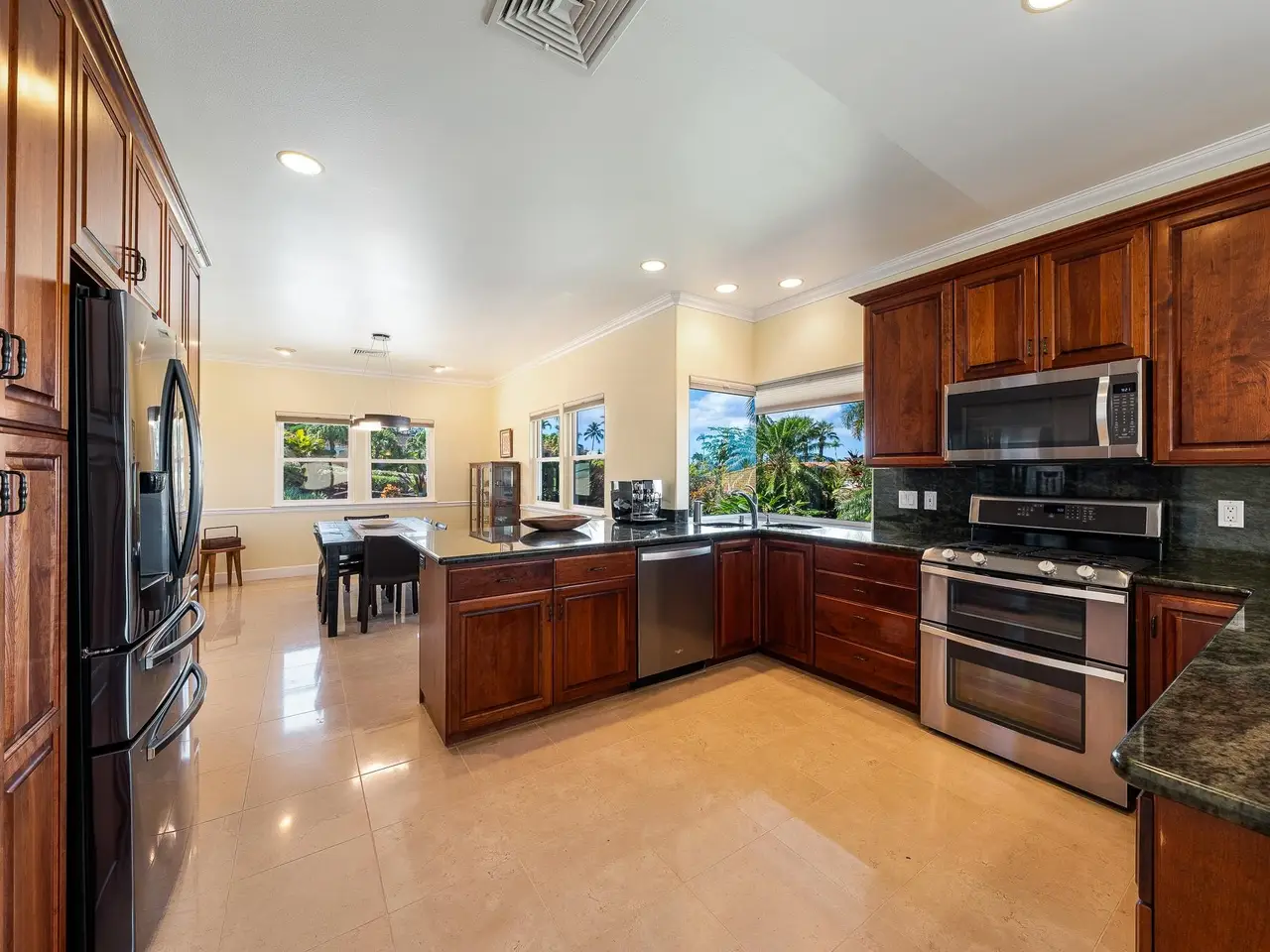 Located at the end of a peaceful cul-de-sac and bordering a lush greenbelt, this exceptionally designed 4 bedroom, 2.5 bathroom home in the prestigious Wailea Kialoa community offers privacy and ocean, sunset, and neighbor island views. The split-level layout provides effortless living with the main level featuring a gourmet chef’s kitchen, a formal dining room, a spacious living area, a luxurious primary suite, a bedroom that serves well as a private office, a powder room, and an attached garage—all designed for comfort and style. The lower level is an entertainer’s dream, with a large den that includes a wet bar, under-counter fridge, wine fridge, and easy access to the pool deck, BBQ area, and a serene private backyard. Luxuriously appointed throughout, the home showcases crème Vienna limestone and burled eucalyptus flooring, rare green granite countertops, and custom cherry cabinetry, highlighting the attention to detail and quality craftsmanship. A laundry room and ample storage areas add to the convenience of this warm and inviting home. The garage is equipped to store your golf clubs, surfboards, and recreational gear, ensuring you are always ready for Maui’s outdoor adventures. Both a PV solar system and a solar water system are in place, thereby reducing the ecological footprint of the property, while the private backyard offers ample space for a garden, creating a perfect blend of luxury and sustainability.