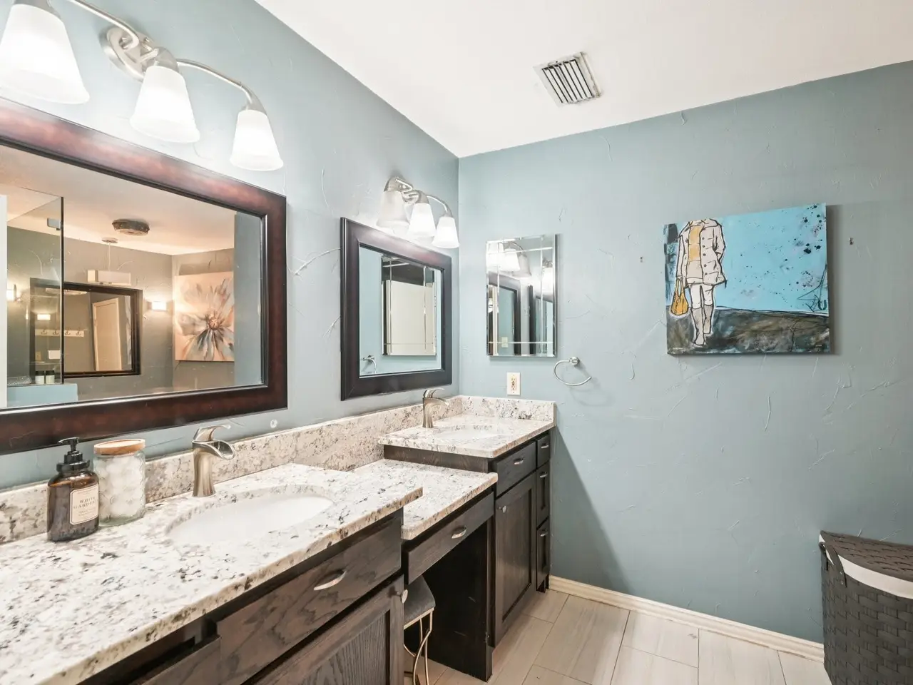 Traditional 5 bedroom, 4 full and 1 half bath home situated on a treed cul-de-sac lot in Trophy Club with a recently expanded (2023) footprint including a second primary suite, second library, game room, and a gym. Double iron doors welcome you and lead you to the expansive combination living and dining room with soaring ceilings and a see-through fireplace. Off the living is a bi-level library, with a spiral staircase that connects to the cozy second floor library. The adjacent family room is wired for surround sound and offers a see-through fireplace and wet bar. Opposite the living room is the well-appointed kitchen which features an island, electric cooktop, dishwasher, walk-in pantry, built-in desk, and adjoining breakfast room overlooking the intimate backyard oasis. A primary suite is located downstairs and boasts dual sinks, a soaking tub, separate shower, and walk-in closet. Rounding out the downstairs is a half-bath off the living room. Upstairs the second primary suite offers dual sinks with mirrored storage cabinets, decorative lighting, a designer tiled wet room featuring a soaking tub and spacious shower, a walk-in closet, and a balconette. Also upstairs is a gym with exercise flooring and a game room with surround sound speakers and projector. One of three secondary bedrooms connects via a Jack-and-Jill bath to the full-size laundry room with a murphy bed. The remaining two secondary bedrooms share three walk-in closets and a Jack-and-Jill bath. The dual primary suites make this home an ideal candidate for multi-generational living. Outside there is a soaking pool with waterfall feature and a pergola. There is also an enclosed covered patio with glass doors leading to the main living-dining area. Three car garage with additional parking and a manual gate. Please see full list of updates and improvements in the MLS Transaction Desk.