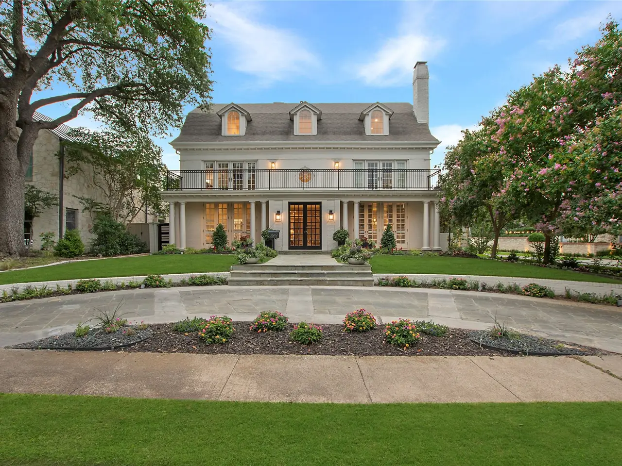 Commanding attention on its gorgeous 66 x 150 corner lot in prestigious University Park near Centennial Park, Curtis Park, University Park Pool, and the Volk Estates, this custom-built classic traditional home masterfully blends timeless architecture with refined transitional style and has been previously featured in Architectural Digest. The stately three-story brick home, with its Gambrel roof and surrounded by manicured landscaping and blooming crepe myrtles-offers a seamless blend of classic charm and elevated, transitional style-delivering effortless luxury from the very first glance. Step inside to soaring 10-ft. ceilings, rich hardwoods and an expansive central hall that anchors elegant entertaining spaces and intimate retreats. The formal living room, with its limestone fireplace and French doors, opens to a private outdoor oasis. Both with light-filled French doors opening to the outdoors, a formal dining room leads to a scenic side patio and a richly appointed library opens to a front porch-adding to the homes dignified charm. The chef's kitchen dazzles with white Carrara marble, a Wolf commercial range, and premium appliances-think Sub-Zero, Thermador, Asko and Hoshizaki-flowing seamlessly into a cozy breakfast nook. With French doors opening to a front porch, the downstairs primary suite is a tranquil escape with its gorgeous spa-like white quartz and porcelain tile bath & custom walk-in closet. Upstairs, an oversized den, sitting room, 4 spacious bedrooms & a private guest suite with its own bath & adjacent kitchen offer space & flexibility. The 3rd floor reveals a game room, mirrored gym or playroom & a full bath-easily convertible to a 7th bedroom. Outside, a serene pool & spa-complete with soothing fountains, color-changing LED lights & surrounded by turf grass & honed limestone-invite relaxation & entertainment year-round. A 2-car garage with sliding gate completes this rare offering-an effortlessly elegant home in the heart of University Park.