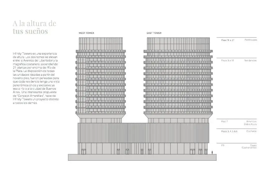 Located at the intersection of Libertador Avenue and Arenales Street, the distinctive residential building stands in Vicente López. It has a ground floor of commercial premises that adds to the other offers in the area. The building is made up of 3 basements, ground floor, 2 between floors and 18 more floors. The units are distributed in the two elliptical towers from 24 meters high, ensuring that all units have views from above, towards the Río de la Plata and/or the City of Buenos Aires. The 130 units have 161 parking spaces. Units of 2, 3, 4 and 5 rooms with outbuildings. 14 penthouses of 3 levels. 8th floor of amenities: SUM, meeting rooms, indoor pool, gym, sauna and grills. Ask about other units! The property offered is not accessible for people with reduced mobility. Details - Total area: 229 m2 - Type: Apartment - Bedrooms: 3 - Age: Brand new - Bathrooms: 3 - Toilettes: 1 - Covered area: 190 m2 - Semi-covered area: 38 m2 - Rooms: 4
