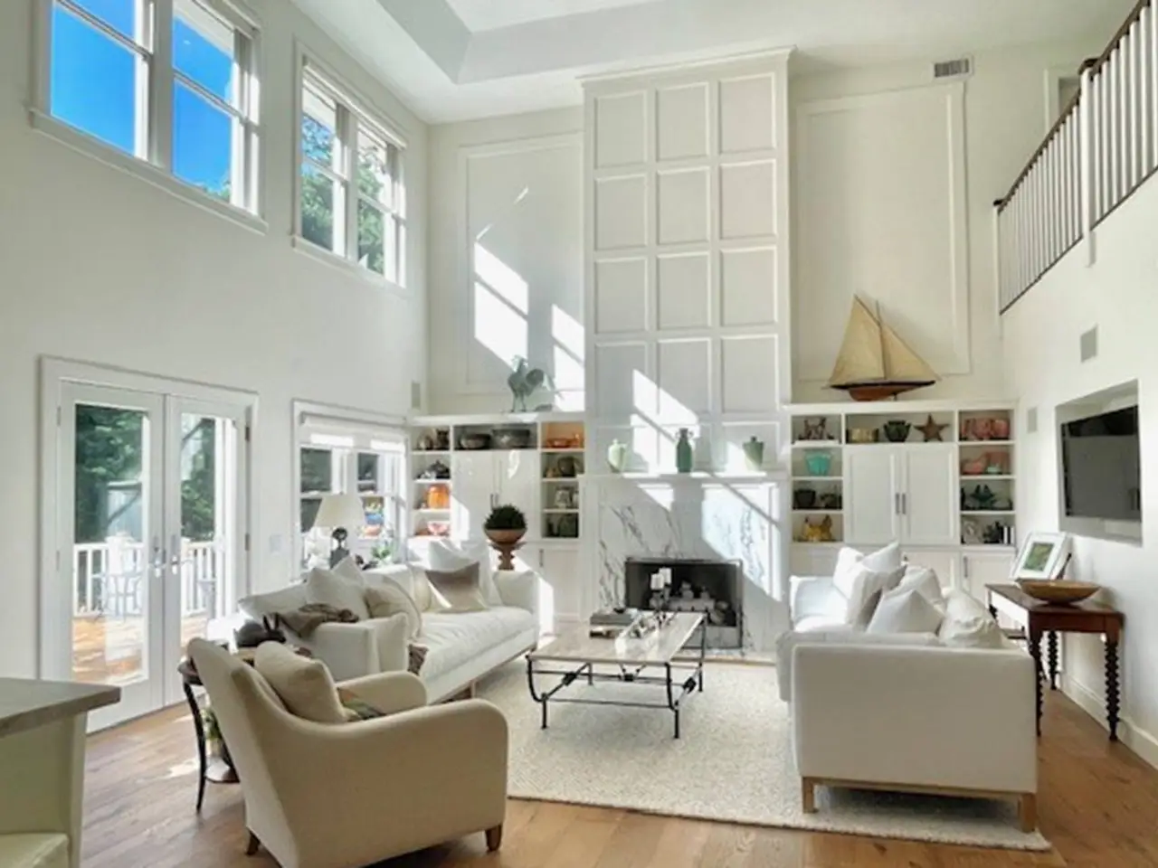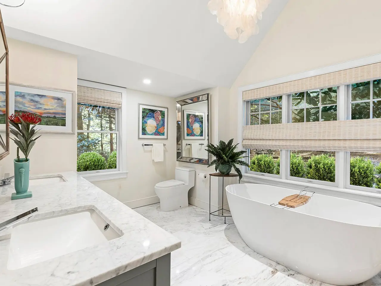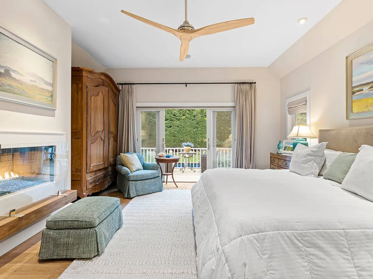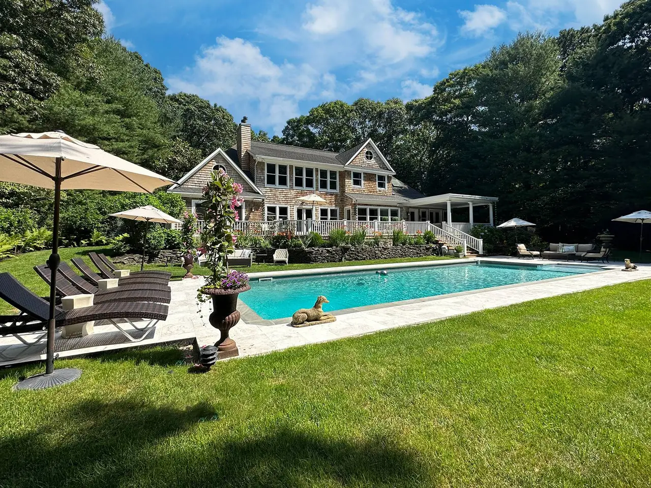 Beautifully appointed, this 4,500 square-foot traditional contemporary, situated down a meandering driveway, offers soaring double-high ceilings with an open concept interior and cascading southern natural light. The two-story gem is located just minutes from East Hampton Village, with world class beaches, designer shops and boating marinas. The welcoming foyer opens into a designer-finished living room with a stately full-height fireplace hearth and numerous oversized windows and glass doors. All flow into a brand new 'state of the art' chef's eat-in kitchen featuring a Wolf stove, microwave and oven, a Miele column refrigerator, and a Thermador column freezer complete with Quartzite countertops. On the first level, there is also a formal dining room and an inviting family and media room that opens out to spacious decking with a large covered porch for indoor-outdoor living at its very best. Wide plank white oak floors enhance this newly-designed modern decor. You will also enjoy a luxurious, newly-renovated primary bedroom suite with marble baths and a soaking tub. The bedroom is complimented with a linear glass jewel fireplace, all located on the first floor. The primary wing overlooks park-like towering mature trees with flowering gardens and a heated pool with built-in grill and entertainment areas. The second floor offers a 2 bedroom private wing with a bath and an additional two bedrooms with a shared bath. This thoughtfully landscaped property in an upscale neighborhood also offers a basketball court and all-weather community tennis courts for family enjoyment. Minutes from local farm stands, biking and hiking trails and LongHouse Reserve, a sculpture museum with indoor and outdoor living art featuring numerous events and tours. The iconic, world class 'Main Beach' is just a 5 minute ride away with boardwalk dining and evening beach concerts all season. This is your summer oasis with every amenity and luxury desired to enjoy Hampton's summer vacation.
