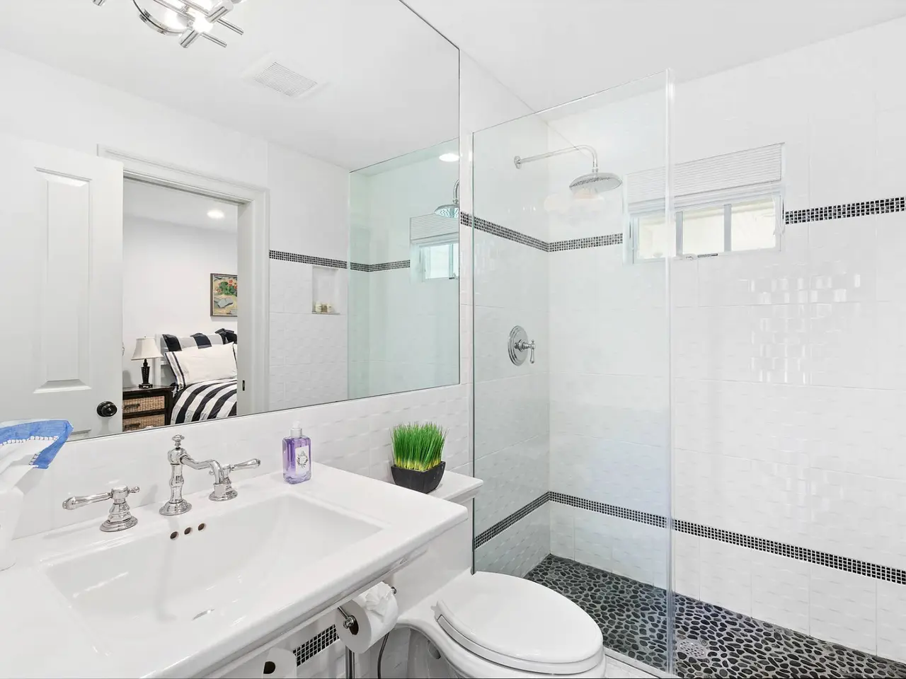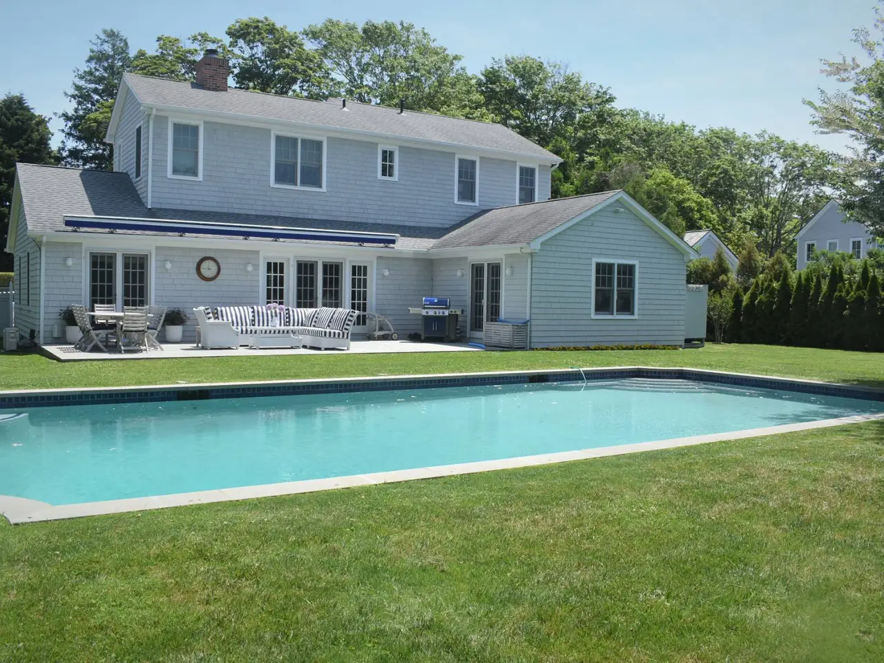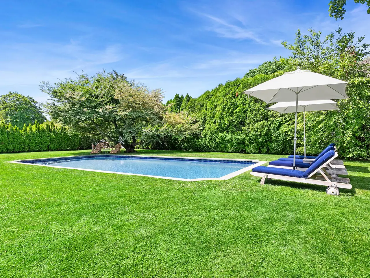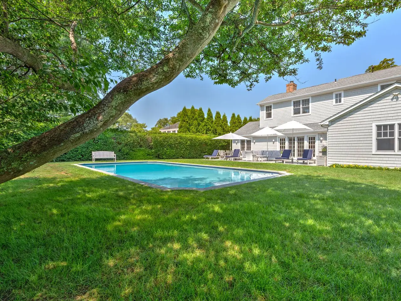 Pristine five bedroom, five bath Traditional on a tranquil Village lane, moments from several village ocean beaches. French doors open out to bluestone terrace, lawn and sparkling, heated gunite pool. First floor has one master bedroom, one en suite guest bedroom and one small bedroom and hall bath near a stylish den. Bright living room with fireplace, eat-in kitchen, two upstairs bedrooms and baths. Lower level has an additional seating area and hybrid infrared sauna.