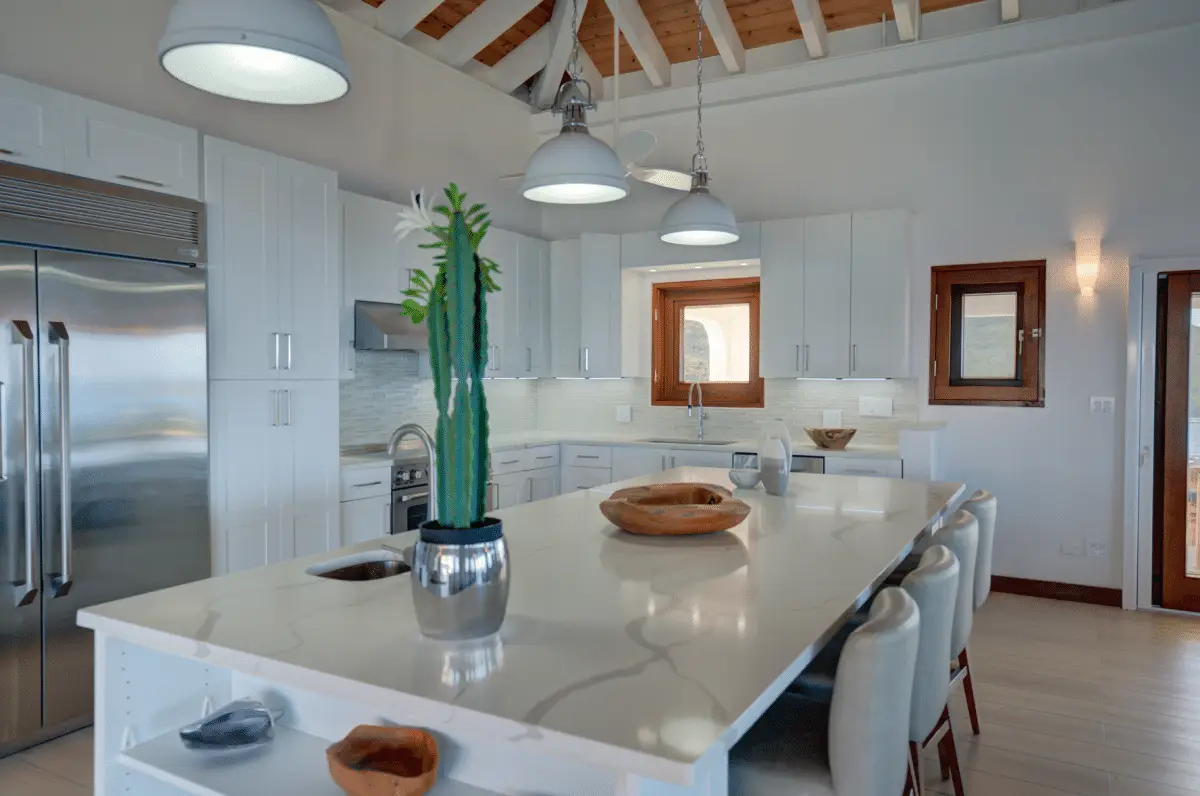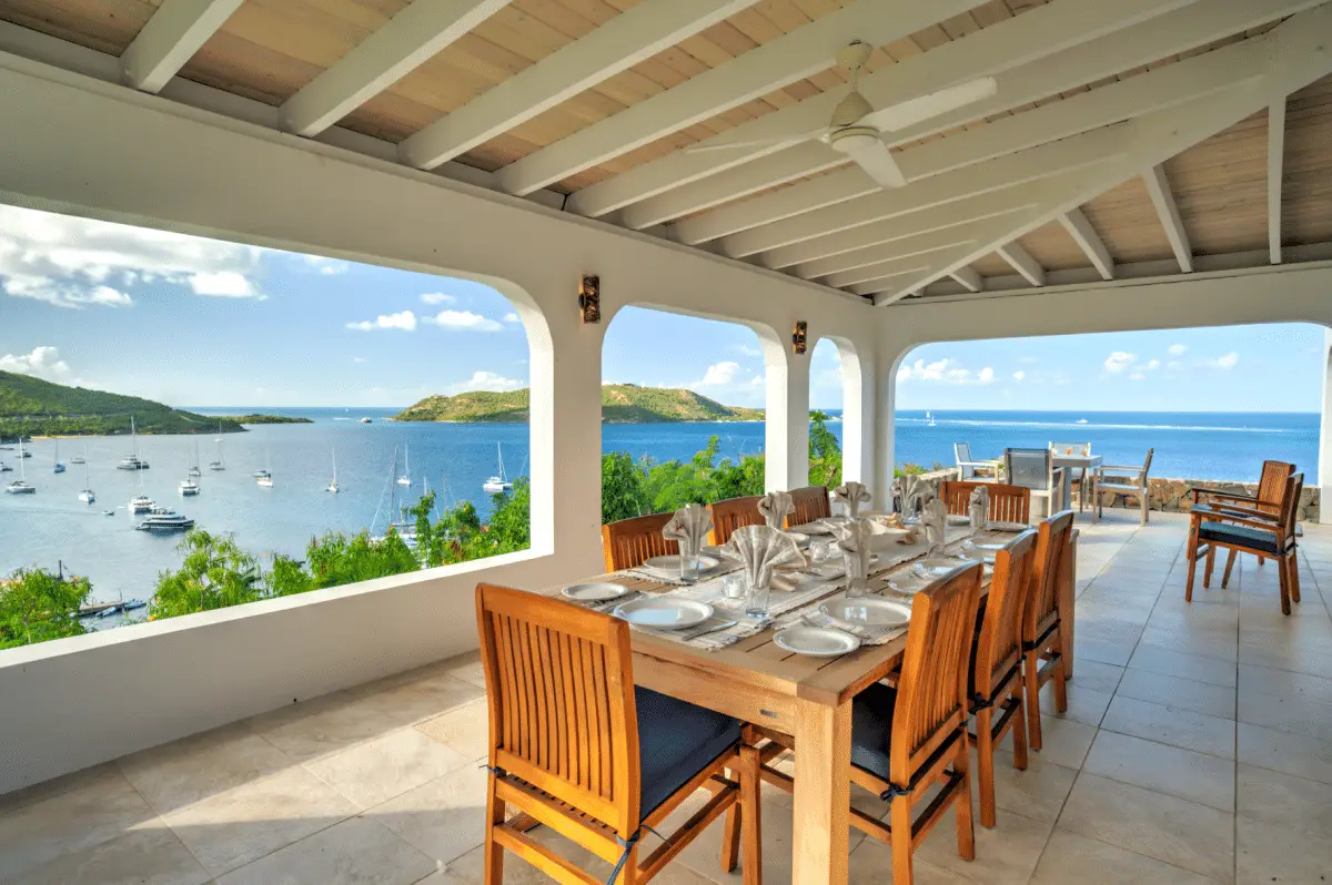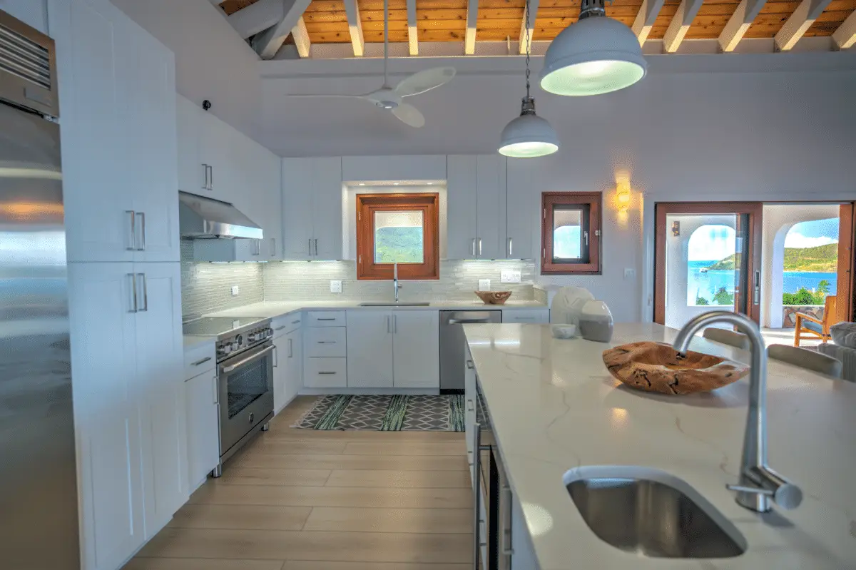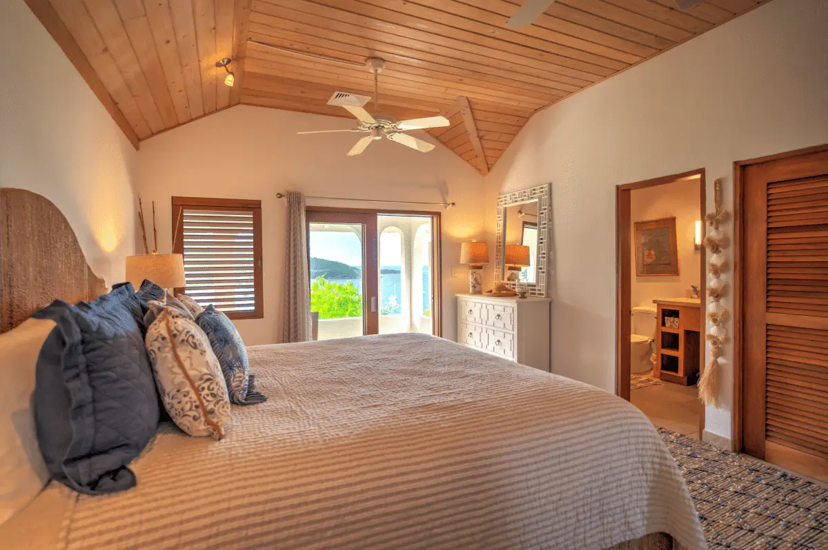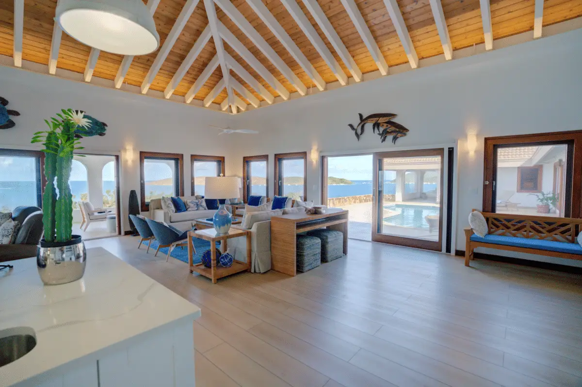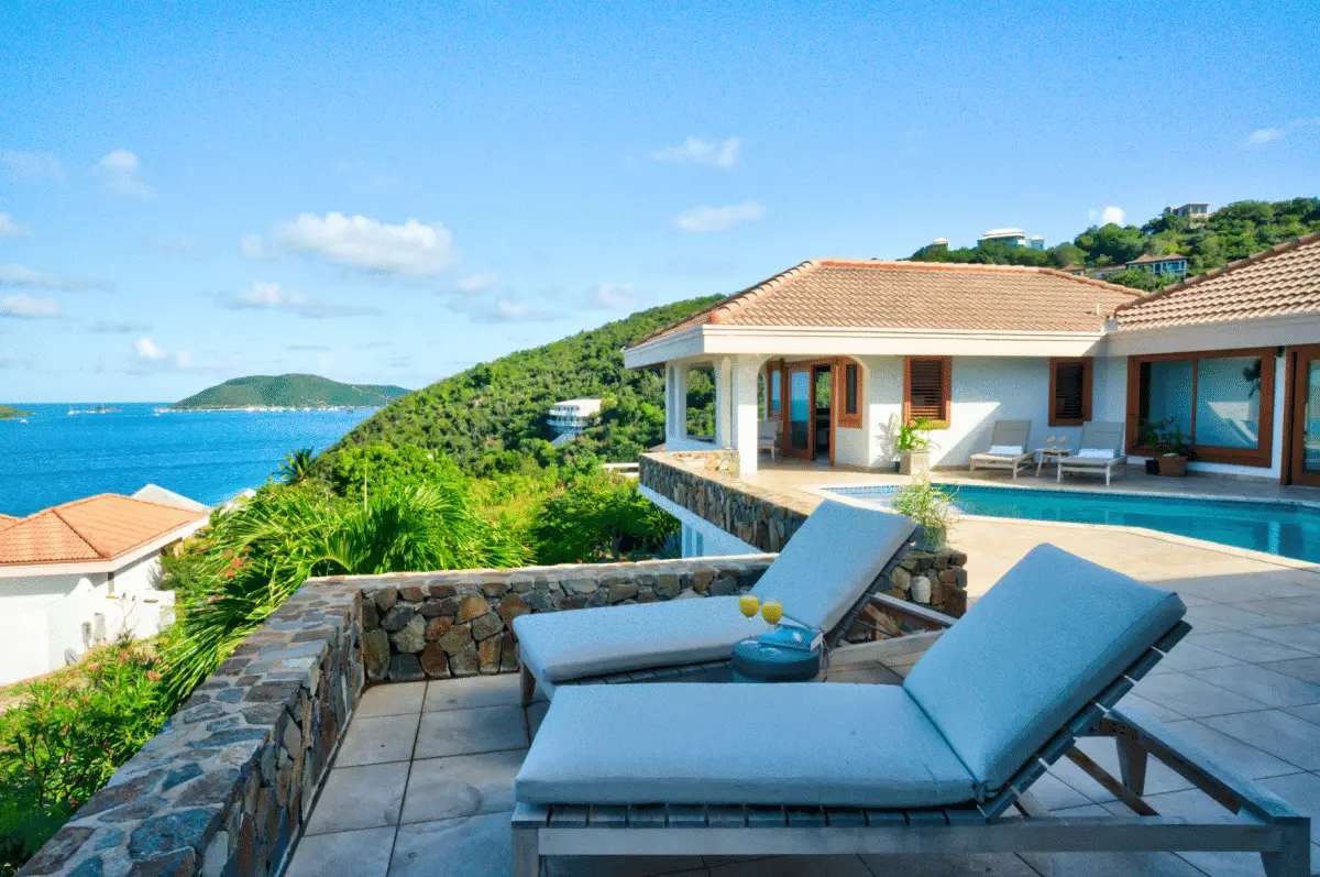 Located above Leverick Bay, with the most spectacular view in the North Sound, this beautiful property affords island living in luxury and style. A short drive from the Leverick Bay Marina, Christa Villa is conveniently located near to shops, two excellent restaurants, spa, watersports, and the marina.<br /> <br /> Christa Villa is unobtrusively set at the front of a hillside overlooking the islands of the North Sound Channel. This superb residence was recently renovated and now sets a new benchmark in contemporary living in the Leverick Bay Estate. From its magnificent Great Room and each of the six ensuite bedrooms, there are unobstructed views of the brilliantly blue Caribbean Sea. The vista spans Blunder Bay to the west, Moskito Island, Necker Island, Eustatia, Saba Rock and Bitter End Yacht Club to the east.<br /> <br /> Christa Villa is set on 0.8 acres of freehold land with well-tended, mature tropical landscaping. A short walkway leads from the garage and four-car parking area to the upper level of this beautiful home. Stepping into the Great Room, with its cathedral-ceiling, and magnificent views, there is an undeniable, awe-inspiring WOW-moment. German custom-made mahogany doors frame impact-resistant glass panes that let in plenty of light keeping the room bright and airy.<br /> <br /> The open-plan Great Room encompasses a sleek, modern kitchen, expansive stone-topped island with bar-height seating, a luxurious drawing room, and a relaxed family/TV area. To capitalize on the panoramic view and cool Trade Winds, the Great Room is surrounded by wide, covered verandahs. There is seamless flow from the Great Room to the outdoor dining table on the west-facing verandah, and to the multiple seating clusters, and sparkling swimming pool. The 3,500 square feet of covered space is superbly finished and topped by dramatically high ceilings of pickled white cypress under concrete tiled roof. There is an additional 2,000 square feet of exterior space that includes the swimming pool deck, terraces, and walkways.<br /> <br /> Masterfully designed, the five luxuriously, spacious bedrooms on the upper level are built, so each enjoys amazing seascape views, and has easy access to the pool deck. The free-from pool is centrally located to capture morning, mid-day and afternoon sun, keeping it naturally heated all day. The spacious pool deck is sun-filled year-round and affords plenty of room for lounging.<br /> <br /> A stroll along a path of native stone, accesses the lower level of Christa Villa, where a comfortable studio apartment provides independent living for staff or guests. This apartment is graced by strong breezes and lush garden views. The tranquility of its secluded setting makes it a peaceful retreat.<br /> <br /> Generous landscaping allows the villa to meld unobtrusively into the natural terrain. Set well off to one side of the property is a platform of solar panels that powers the entire property. A mechanical building houses the battery storage for the solar power, a generator, garage and ample storage.<br /> <br /> The North Sound of Virgin Gorda is reputed to be the Billionaire’s playground with exquisite yachts, world class sailing and international regattas commonplace.  The value of Christa Villa capitalizes on the scarcity of available property in the area, and means ownership of increasing property values. With the high demand for accommodations in Leverick Bay, owners benefit from various leasing options, including vacation rentals.<br /> <br /> Leverick Bay Estate, where Christa Villa is located, has a small-town charm. As part of the private estate, its owners and guests enjoy resort amenities including a pristine beach, sun-warmed pool; two excellent restaurants, spa, shops, commissary, private dock and marina. The Virgin Gorda airport and Yacht Harbour are twenty minutes’ drive away while the airport at Beef Island is twenty minutes away by boat.<br /> <br /> &nbsp;<br /> <h3>Additional Details</h3><br /> <strong>Furniture</strong><br /> Modern Contemporary. Jaipur and Beacon rugs were handwoven in India. Furniture coordinated from Blu Dot, Room and Board,  Pottery Barn, Restoration Hardware and other top-of-the-line designers.<br /> <br /> <strong>WiFi</strong><br /> Wireless, high-speed internet is available throughout the Upper and Lower levels and on Terraces and Pool area. Also available is fibre-optic internet, television and landlines.<br /> <br /> <strong>Doors and Windows</strong><br /> German; Custom-made Mahogany;  Glass Panes are engineered specified to hurricane ready specifications.<br /> <br /> <strong>Cabinetry</strong><br /> Custom-made Cabinets and centre island topped with Quartz<br /> <br /> <strong>Solar Power</strong><br /> Solar Panels and battery storage with the capacity to power the entire property.<br /> <br /> <strong>Generator</strong><br /> FG Wilson AC Synchronous Generator with Triple Phase, Automatic Transfer switch. Backup 250KW Diesel Generator<br /> <br /> <strong>Central A/C</strong><br /> Bedrooms have Split AC Units to allow for independent temperature control.<br /> <br /> <strong>Pool</strong><br /> Salt-water pool<br /> <br /> <strong>Landscaping</strong><br /> Multi-Zone drip irrigation system<br /> <br /> <strong>Water</strong><br /> 3 cisterns are located under the Great Room with a total capacity of 45,000 gallons. Property is also fed by government mains for back-up.<br /> <br /> <strong>Laundry</strong><br /> On the Upper Level<br /> <br /> <strong>Sewage/Waste</strong><br /> Traditional Soak-away Sceptic in multi-chambers<br /> <br /> &nbsp;