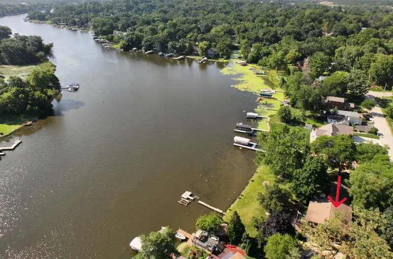 Now Available for the First Time! Discover this spacious five-bedroom home located on four lots along the Fox River, leading directly into Lake Tichigan, featuring over 200 feet of level water frontage. The stunning views are captivating from every direction. Upon entering, you are welcomed by a large tiled, slate foyer that leads to a generous great room, complete with vaulted ceilings and a striking "California Stone" fireplace that reaches the ceiling. The family room includes a cozy fireplace and connects to a three-season room for enjoying the beautiful waterfront. The kitchen, which boasts a brick pizza oven, includes a dining area with river views. The upper-level hosts five bedrooms, highlighted by a sizable primary suite with a connected bathroom, plenty of storage, its own fireplace surrounded by a wall of natural amethyst stone and a marble hearth along with access to a deck overlooking the water. A finished recreation space is perfect for entertaining. Enjoy outdoor living with decks, patios, and a covered patio for rainy days. In addition to the oversized 3-1/2 car garage, there's a sizable, dedicated workshop area.