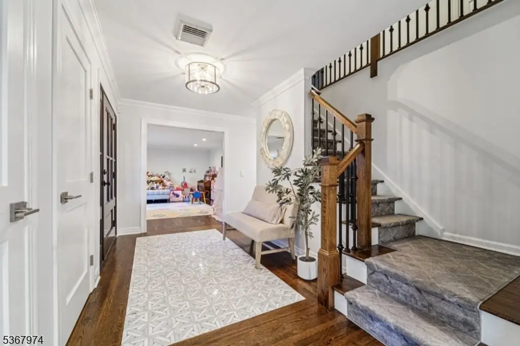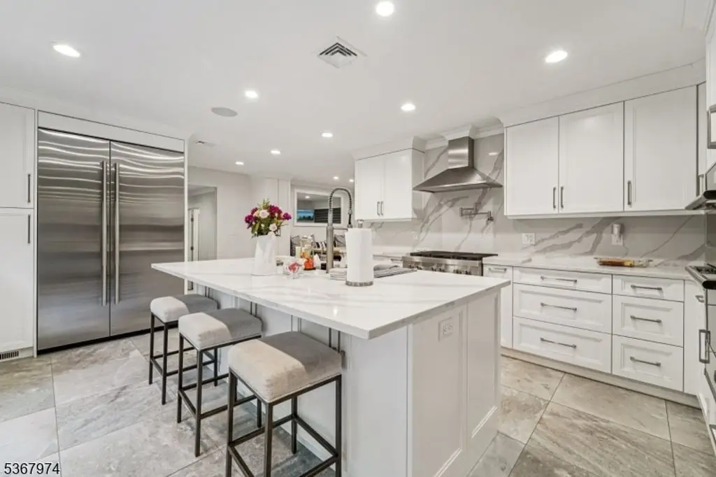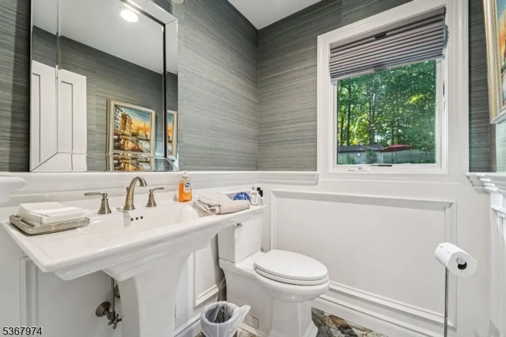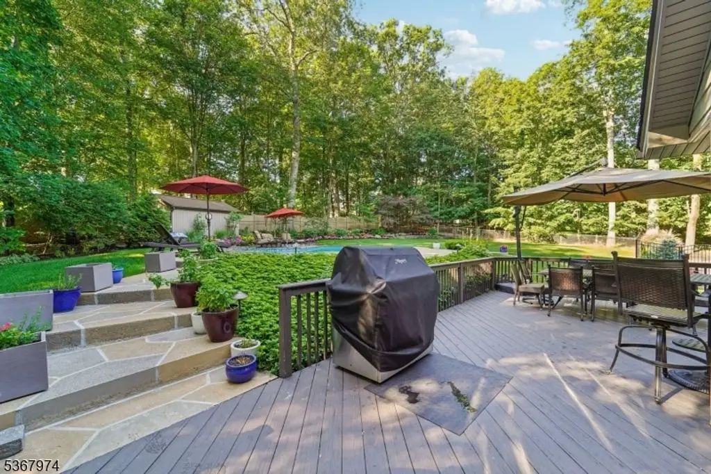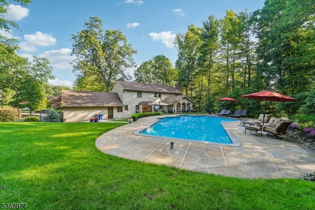 Welcome home to this meticulously maintained 4-bedroom, 2 full and 2 half bath Tudor-style residence, beautifully set on a generous, professionally landscaped lot. A welcoming entry foyer leads into the elegant living room, filled with natural light and perfect for relaxed entertaining. Continue into the expansive family room featuring soaring ceilings, custom built-ins, oversized windows, and a charming brick fireplace an ideal setting for cozy evenings. The formal dining room offers the perfect backdrop for everything from quiet dinners to festive gatherings, while sliding glass doors open to a large rear deck designed for al fresco dining and summer grilling. The gourmet kitchen is a chef's dream with custom cabinetry, Corian countertops, double wall ovens, gas cooktop, and center island with bar seating. A mudroom, laundry area, powder room, and garage access add convenience to the main level. Upstairs, the serene primary suite boasts a sitting area, walk-in closet, and en suite. Three additional bedrooms one currently used as a home office share a full bath. The full partially finished basement offers den, gym, powder room and abundant storage. Step outside to your private backyard retreat featuring a fully fenced, wooded yard with lush greenery, an expansive deck, an in-ground pool, and patio perfect for luxurious outdoor living and entertaining. This home offers the perfect blend of timeless elegance, everyday comfort, and resort-style living both indoors and out.