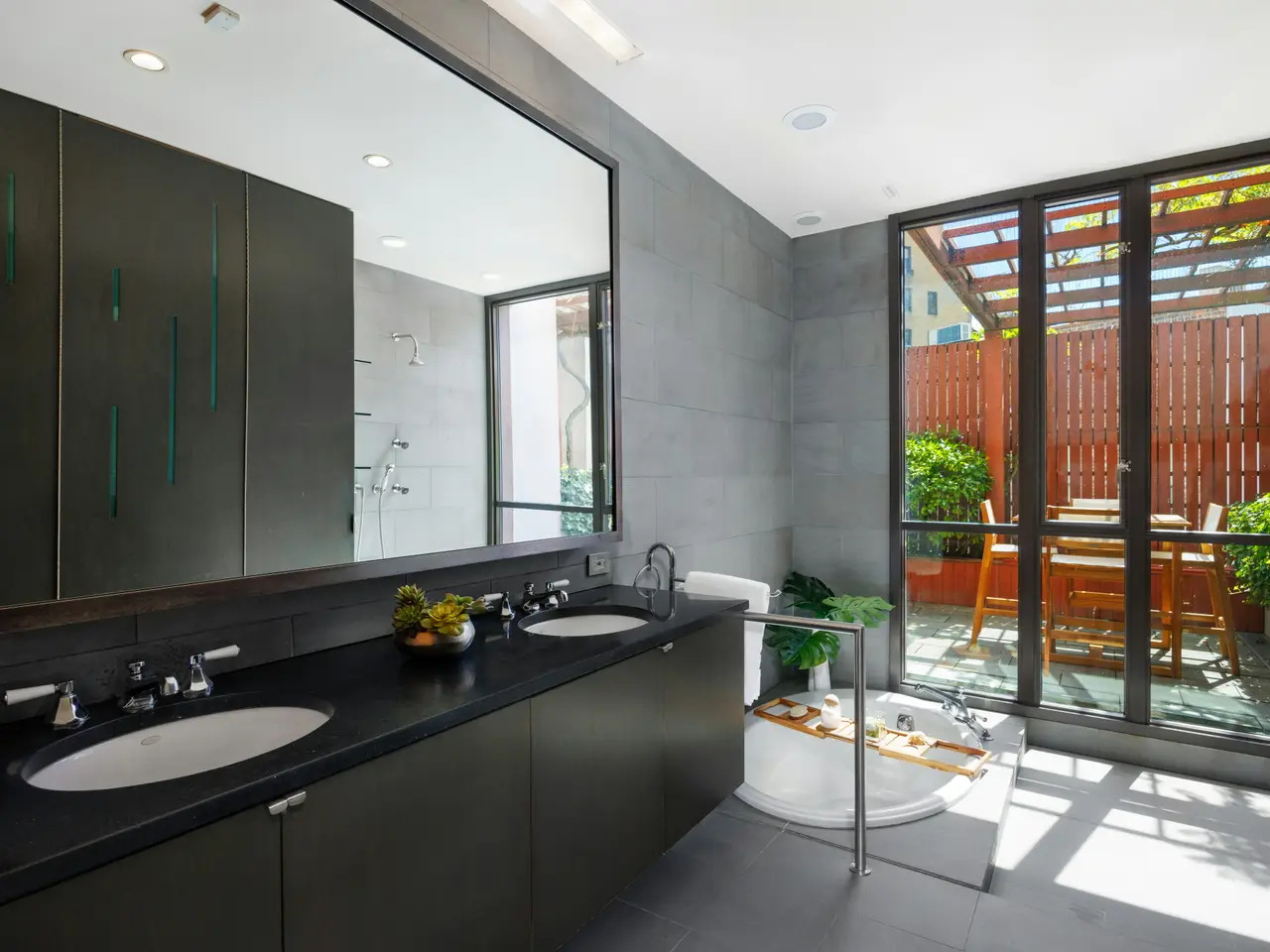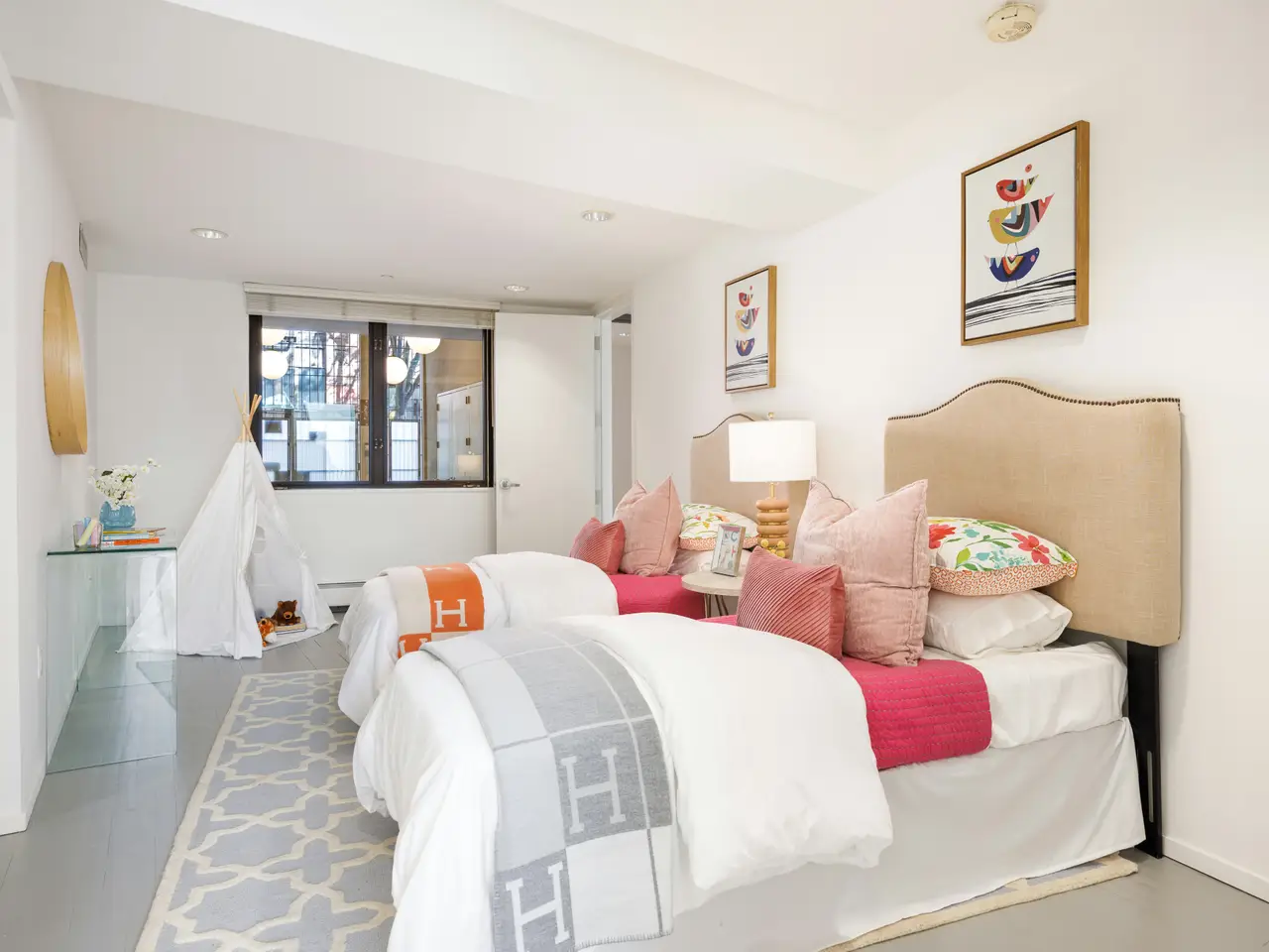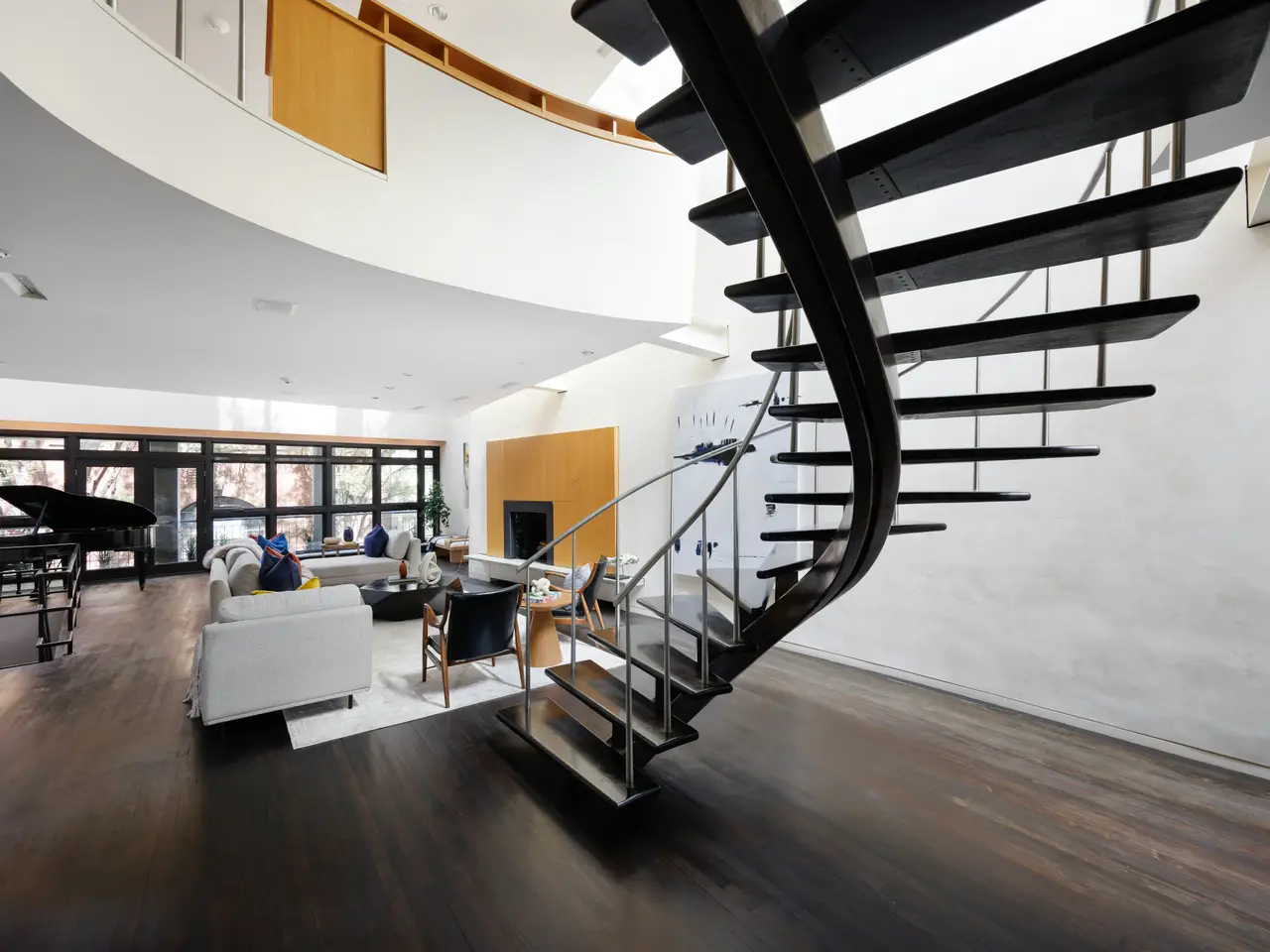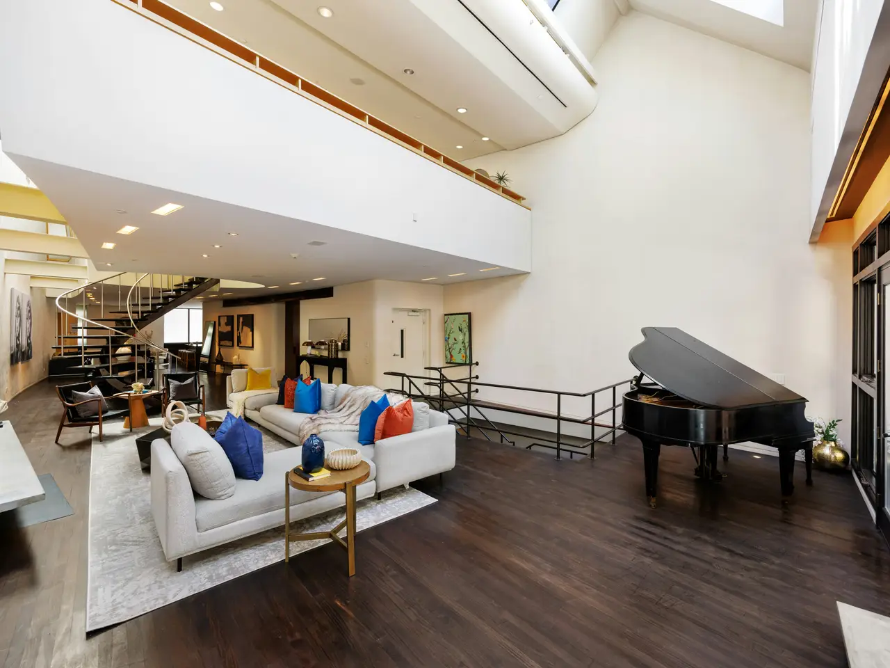 With 29 feet of frontage, including a curb cut, this fabulous 9,000 square foot home features double height ceilings, six outdoor spaces, a private covered parking spot, and an elevator that services the basement to roof deck. Step in off of charming Downing Street to an "open air" garage, that could be used as a garage, a front garden or party space too, with storage. Beyond the garage is the ground floor duplex that could be a perfect guest apartment, art studio, or company headquarters OR it can be combined with the rest of the house into one magnificent single family home. (If part of a single family home the ground floor would make an amazing kitchen/great room open to the back garden.) Features of this lower duplex include three bedrooms and three bathrooms and ceiling heights of over 16 feet in the main space with light streaming in from skylights. This dramatic great room has plenty of space for both a living and dining area, as well as direct access to the tranquil garden. Also on this floor is the large chef's kitchen, as well as a bonus room that has an en-suite bathroom and washer/dryer. The mezzanine level features three oversized bedrooms and two bathrooms. Currently, the main part of the townhouse begins on the second floor, which provides almost unlimited entertainment space with an 80 foot long great room with two terraces and a powder room. The adjacent, open kitchen boasts a 4 burner Garland stove with griddle, 48" Miele refrigerator/freezer, two sinks, two dishwashers, and a Gaggenau hot plate. Up a stunning, curved architectural staircase is the 3rd floor, which currently has two bedrooms, two bathrooms and a large office/den area with three built-in desks and tons of storage that is open to the great room below. Both bedrooms have en-suite bathrooms, built-in desks and the larger bedroom has access to a private terrace. The fourth floor is dedicated to the primary suite and boasts a wrap-around terrace with tall mature plantings and a wooden fence for privacy . The primary bedroom features custom built-ins and opens up to a nearly 30 foot long outdoor space with a pergola and plenty of seating space. The custom primary bath has a double vanity, deep soaking tub, separate shower, and water closet with a bidet. There is also a cedar walk-in closet and a sitting room/lounge with a fireplace, wet bar and additional storage that also has access to the terrace. The gorgeous roof deck, accessible from the elevator , boasts fantastic open skyline views, including the Empire State Building and Hudson Yards. The deck includes multiple seating areas, a pergola, and mature landscaping including birch trees. This unique home also includes a basement with additional storage and laundry. The house is currently configured as two condominium units, and is delivered vacant.
