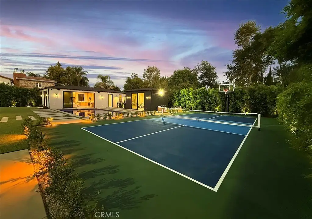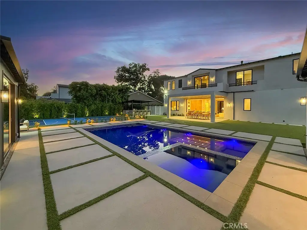 Welcome to this exquisite custom-gated estate, just completed and situated in the prestigious Walnut Acres community of Woodland Hills, CA. Nestled on a tranquil, quiet, and desirable street, this luxurious property offers a total living area of 6,418 square feet. It features a primary residence of 5,369 square feet, an 830-square-foot guest house, and a 219-square-foot gym. The estate features six spacious bedrooms, each with its own en-suite bathroom, as well as a guest bathroom located downstairs. Exceptional amenities include a sports court/pickleball court, a pool, a jacuzzi, a sauna, and an outdoor covered barbecue area. Inside, you will find a state-of-the-art theater room and convenient laundry facilities on both levels. Set on an expansive 18,338-square-foot flat lot, this property presents a rare opportunity to own a home in one of Woodland Hills' most sought-after neighborhoods.